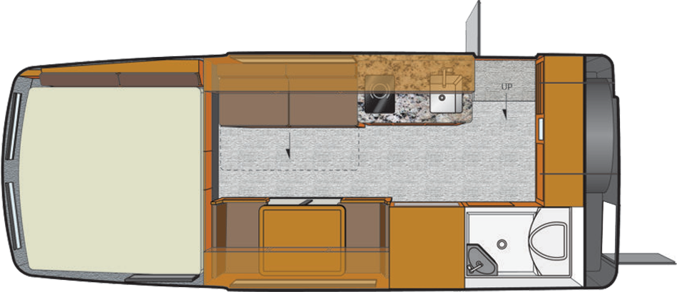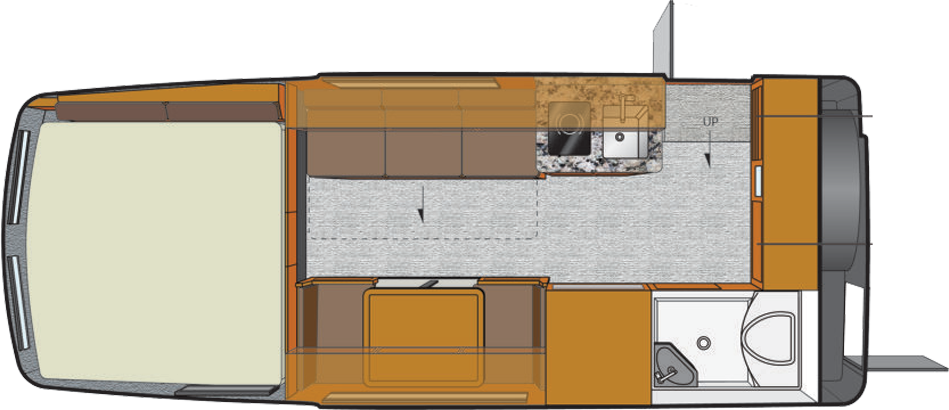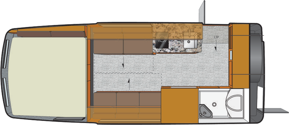 Offers the largest galley with a dinette that converts into 4 bunk beds. Seats 6, sleeps up to 6