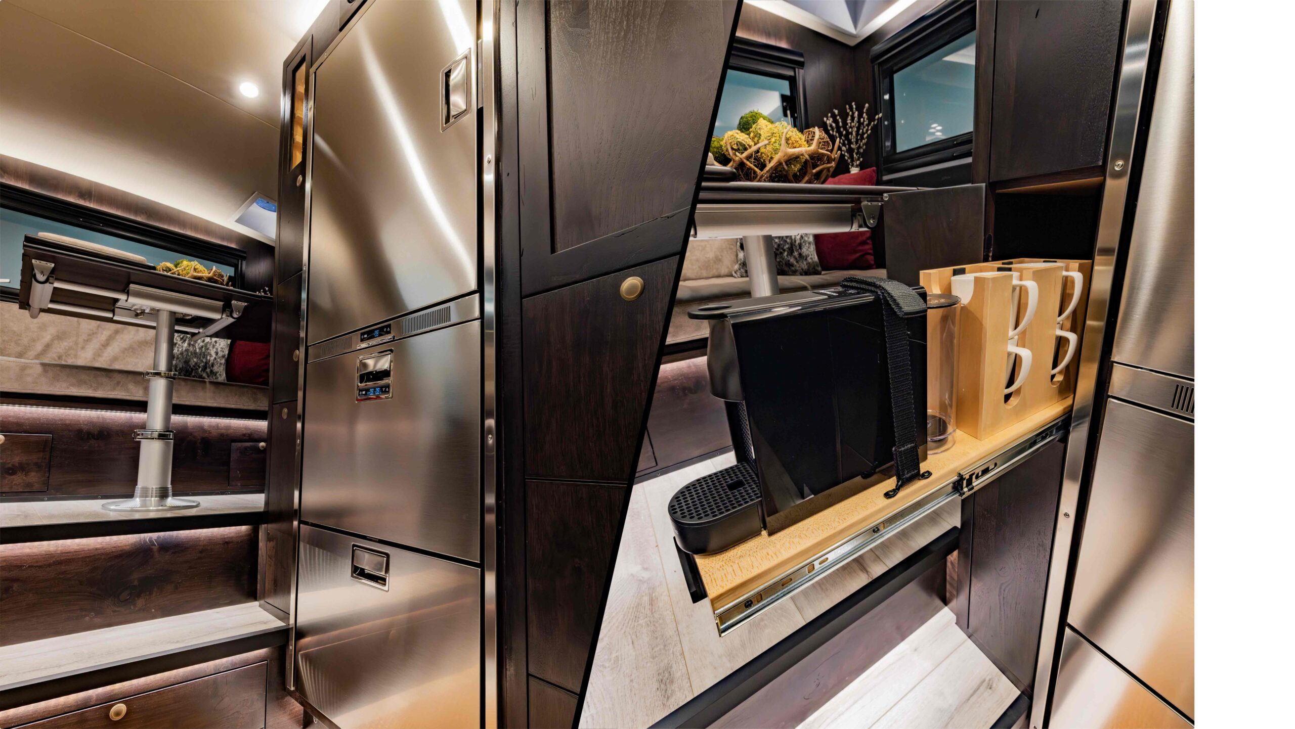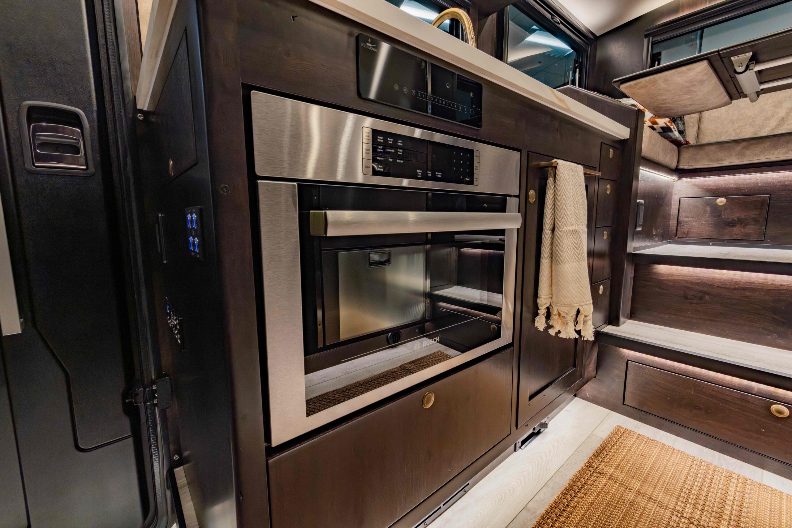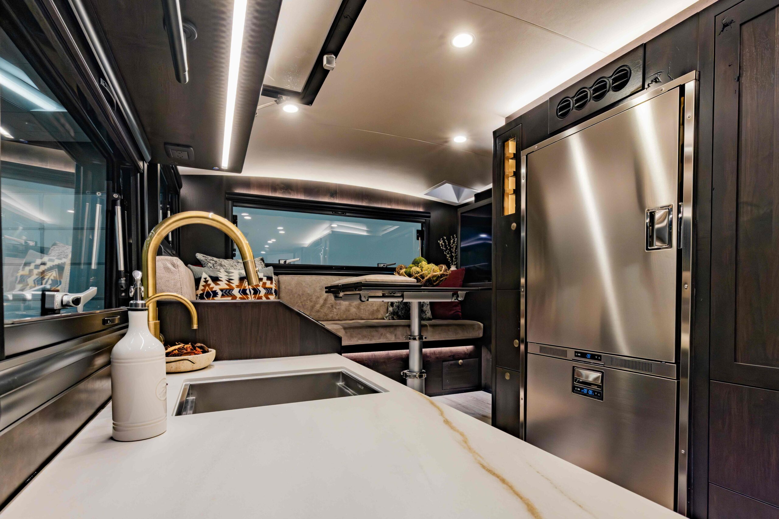 The LTx is equipped with everything you need to prepare and enjoy meals, no matter where your adventures take you. A stainless steel fridge/freezer comes standard, with the option to upgrade to a larger 12-cubic-foot fridge for added storage. The oven-style microwave offers versatility, allowing you to microwave, bake, or broil with ease. You can choose between a drop-in induction cooktop or an Invisacook system, offering sleek and efficient cooking solutions. For coffee lovers, the option of a securely mounted Keurig or Nespresso machine ensures you can enjoy your favorite brew wherever you roam. Upscale touches like a quartz countertop (porcelain with Invisacook), spray faucet, and deep stainless steel sink deliver both style and functionality, creating a kitchen that feels as comfortable and efficient as the one at home.