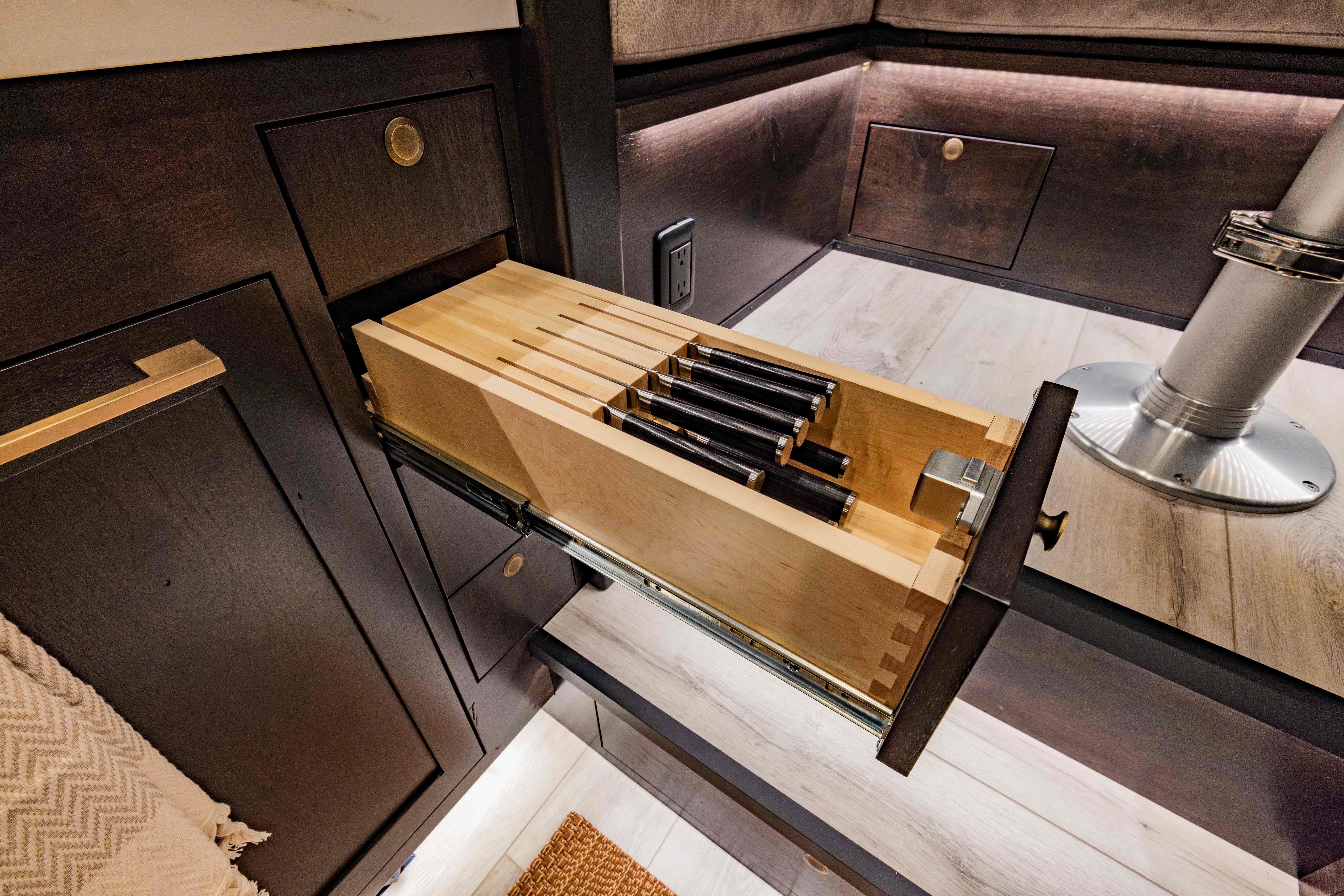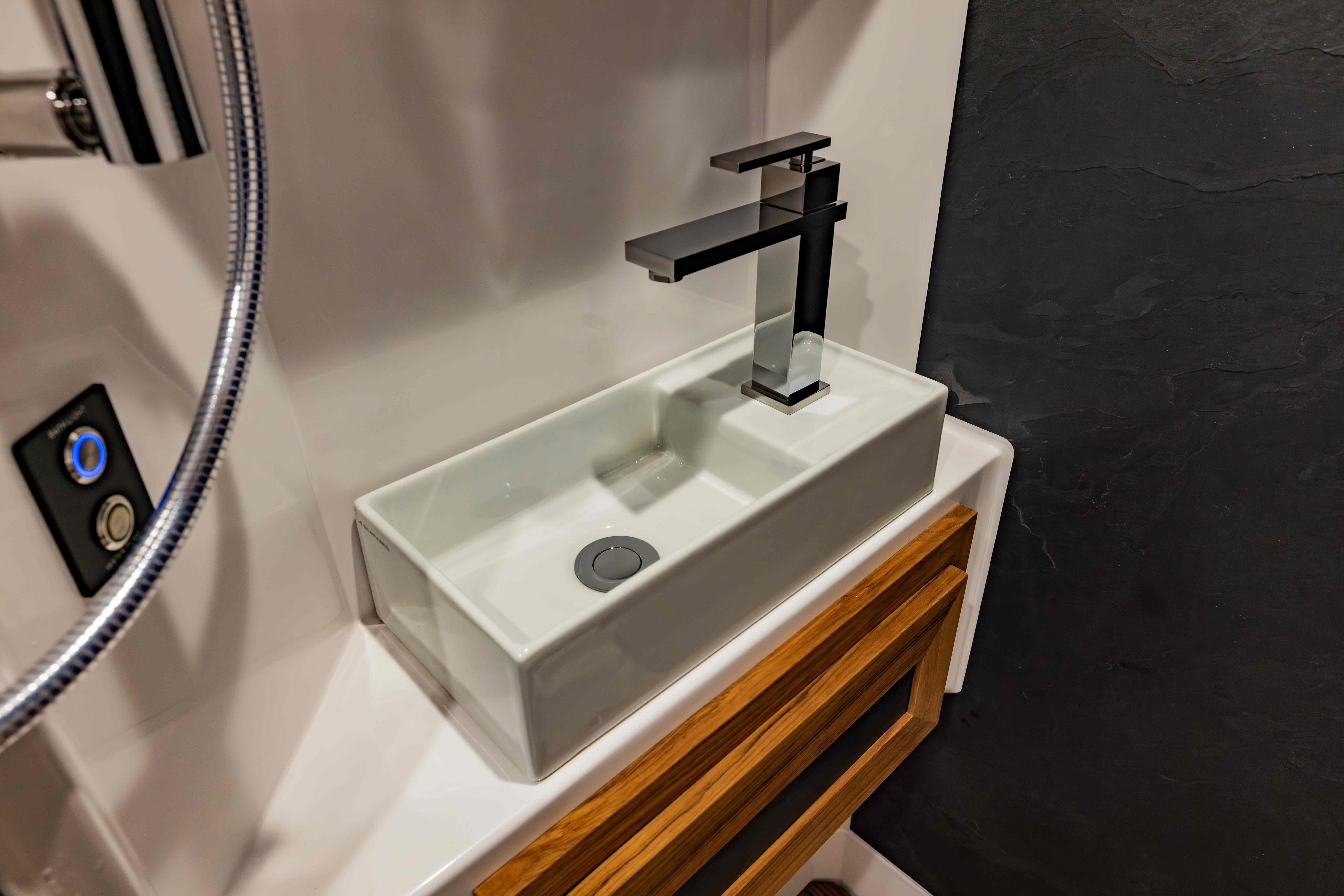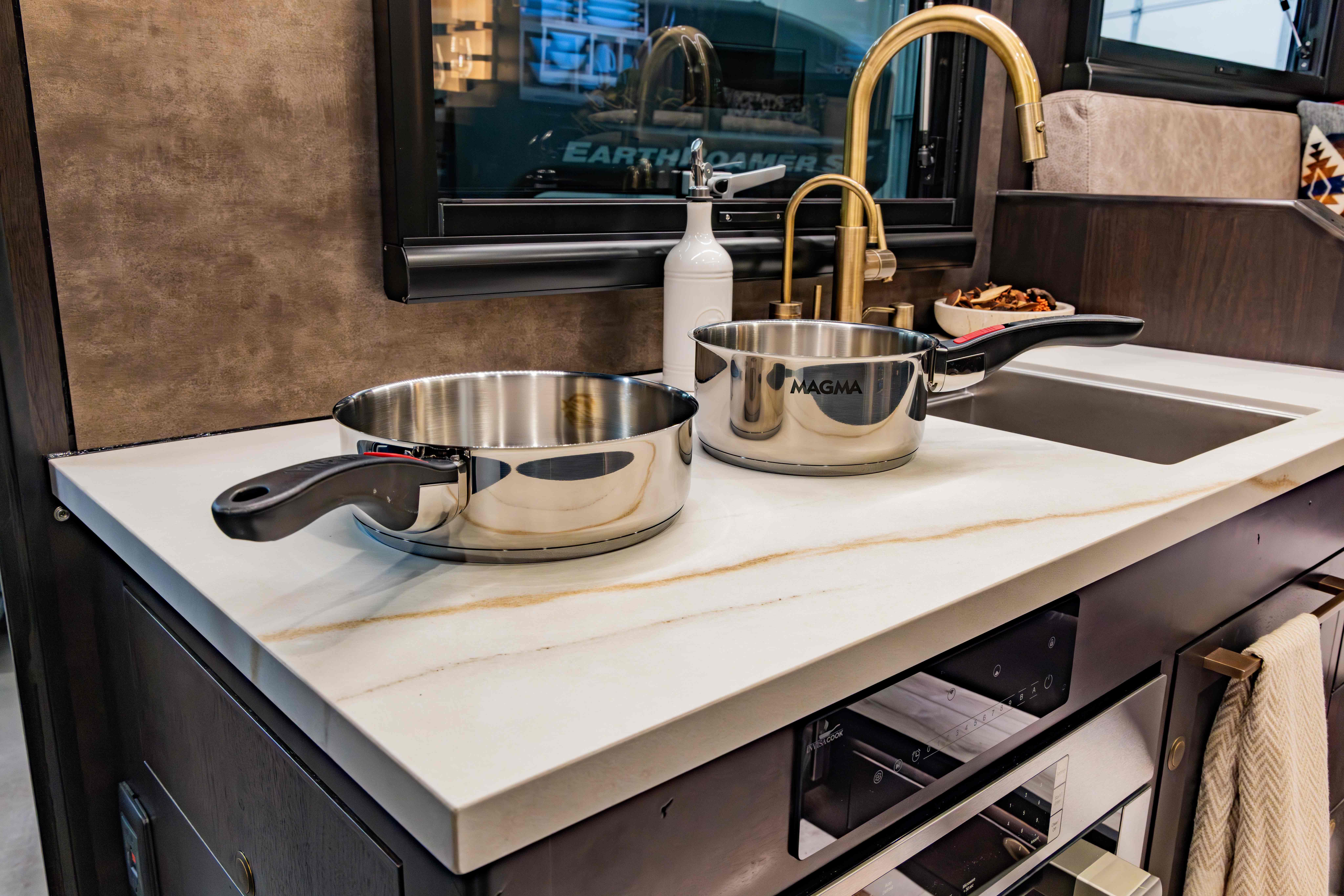 The LTx is equipped with everything you need to prepare and enjoy meals, no matter where your adventures take you. A stainless steel fridge/freezer comes standard, with the option to upgrade to a larger 12-cubic-foot fridge for added storage. The oven-style microwave offers versatility, allowing you to microwave, bake, or broil with ease. You can choose between a drop-in induction cooktop or an Invisacook system, offering sleek and efficient cooking solutions. For coffee lovers, the option of a securely mounted Keurig or Nespresso machine ensures you can enjoy your favorite brew wherever you roam. Upscale touches like a quartz countertop (porcelain with Invisacook), spray faucet, and deep stainless steel sink deliver both style and functionality, creating a kitchen that feels as comfortable and efficient as the one at home.