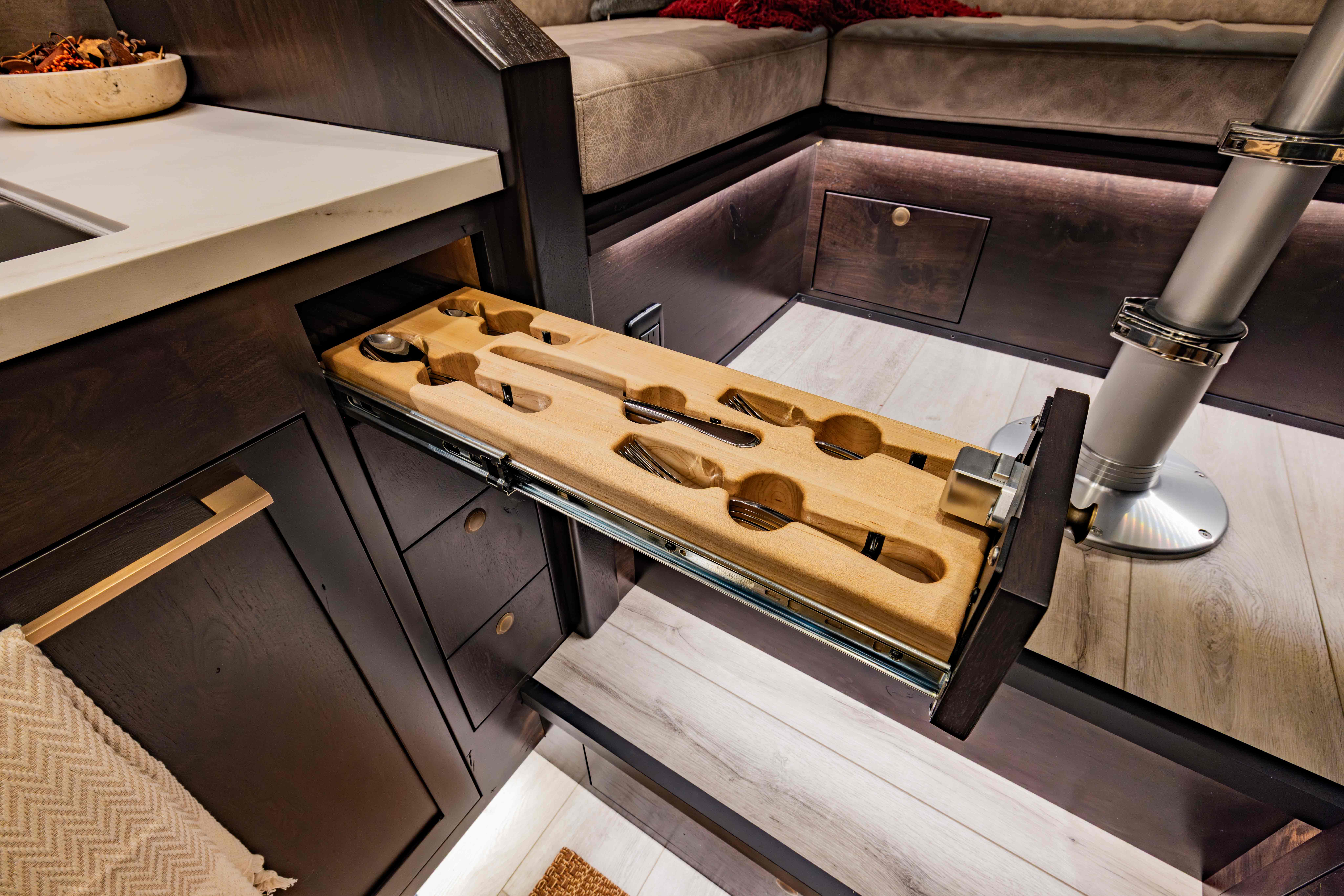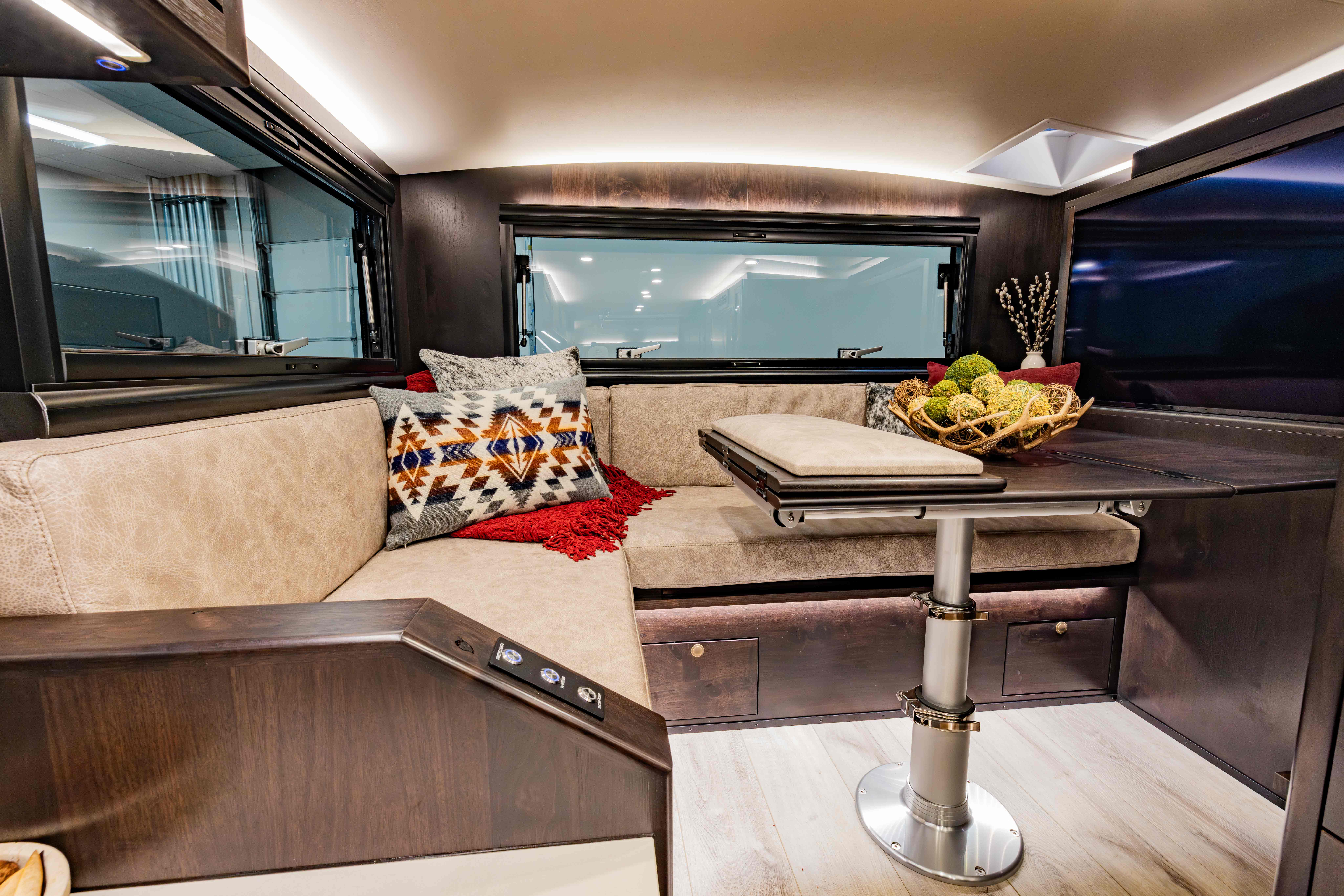 The LTx’s dining and entertainment space is as flexible as it is comfortable, designed to adapt to your needs on the road. The L-shaped couch—or optional two facing benches—provides a cozy setting for meals, relaxation, or socializing. For entertainment, an optional 42-inch TV rises from the cabinet, transforming the space into an immersive viewing experience. The dinette table can be adjusted to dining height for meals, “coffee table mode” for lounging and resting your feet, or removed entirely to create additional storage space. For added convenience, the entire area converts into a full-size mattress, providing a comfortable sleeping option for additional guests. Thoughtfully designed, the Dining & Entertainment space in the LTx ensures everyone can relax and recharge, no matter where your adventures take you.