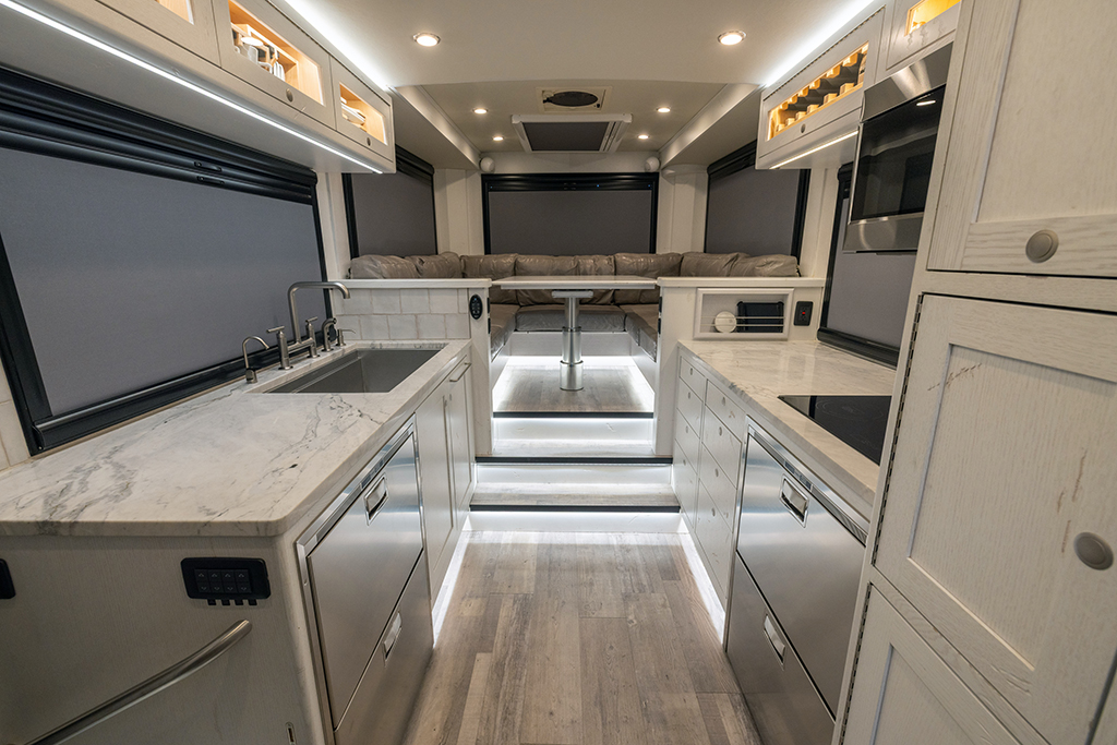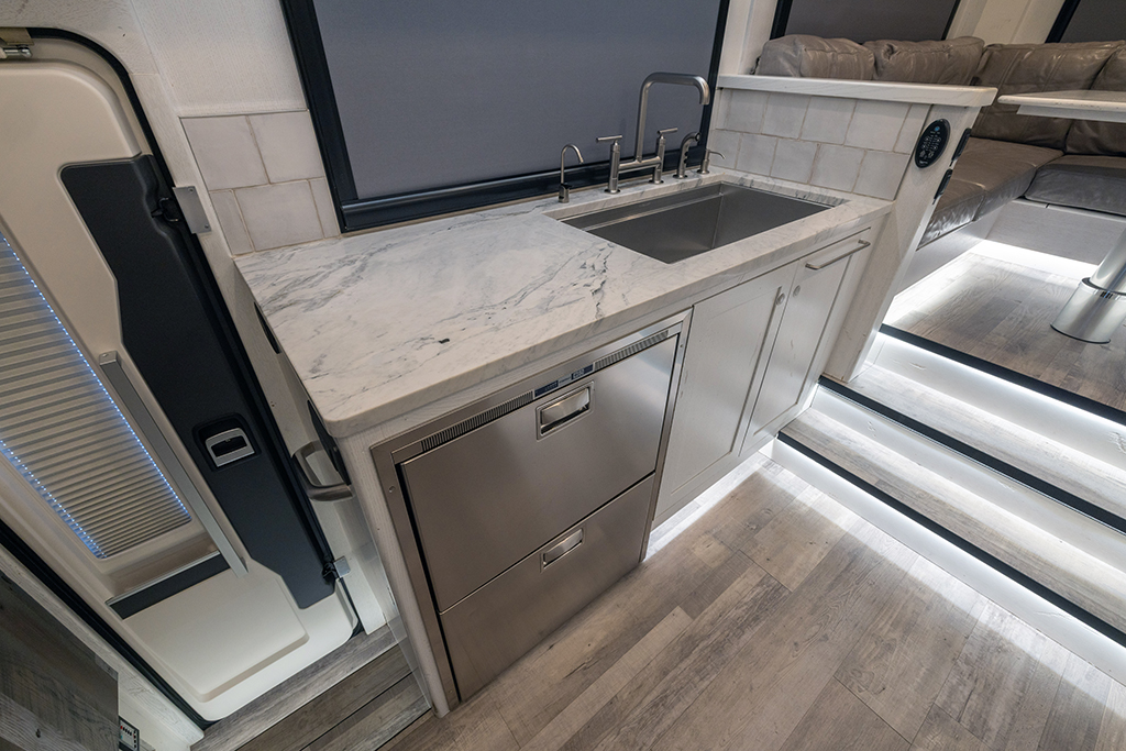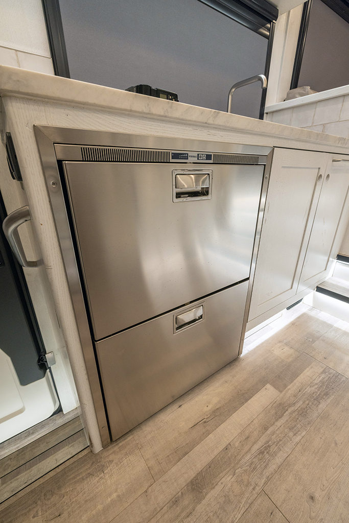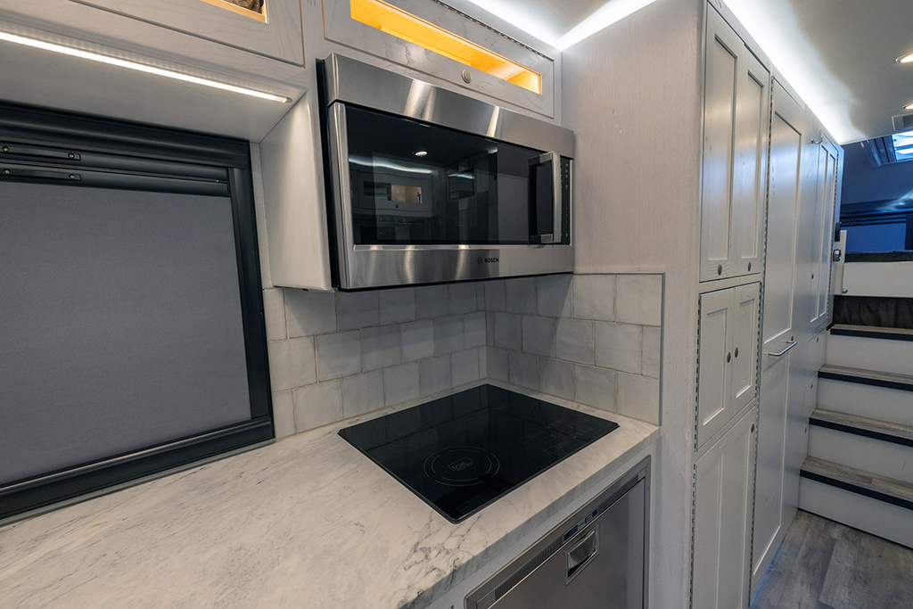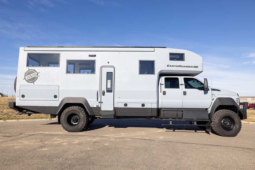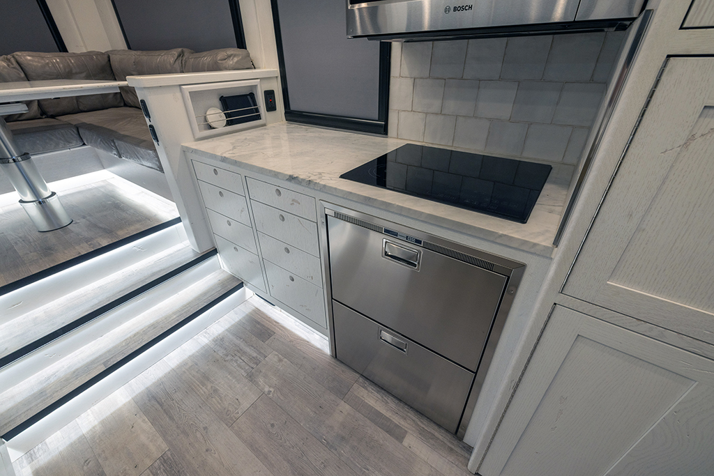 This 2020 HD-005 is ready for it’s new home! The luxury interior of this EarthRoamer features solid wood cabinetry and feels like home on the inside with a large dinette with wraparound seating, dual refrigerator/freezers, and a three burner electric induction cooktop.