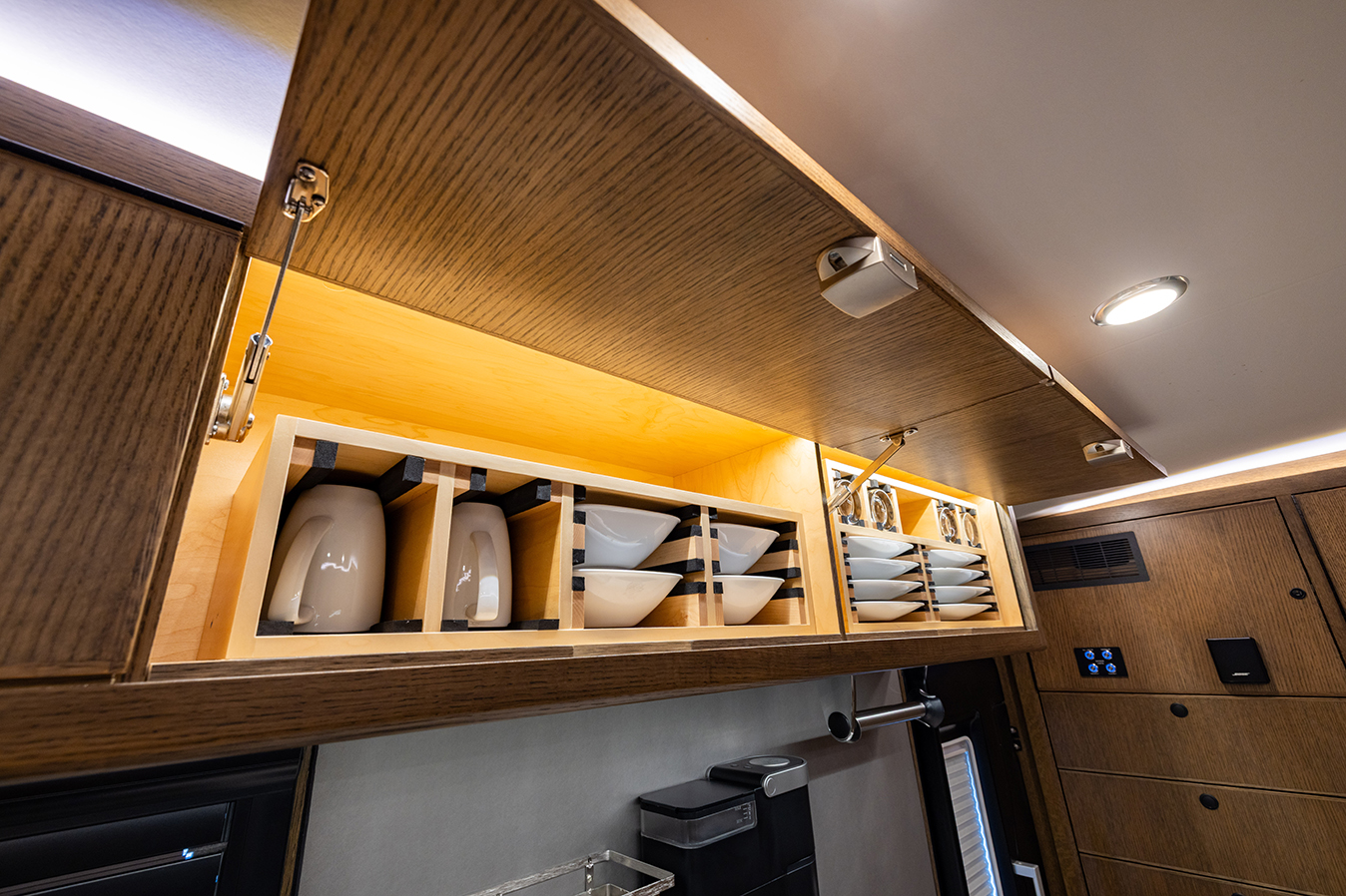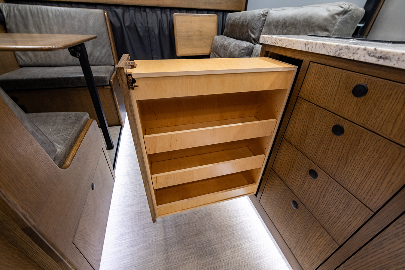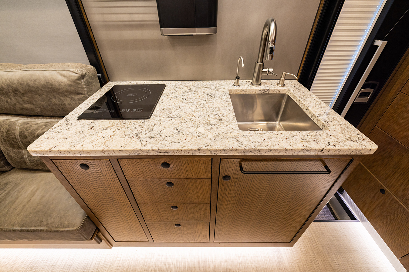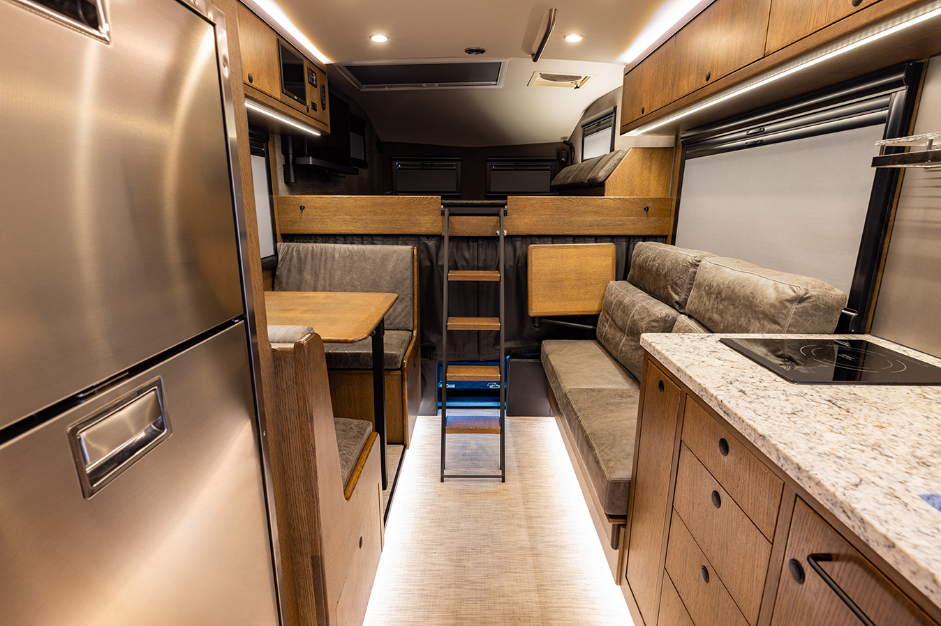 This 2020 XV-LTi is ready for it’s new home! The luxury interior of this EarthRoamer features Glazed Oak cabinetry laid out in the Breckenridge floor plan. LTi #10 feels like home on the inside with a 12-piece set of EarthRoamer nesting induction cookware, wine rack, and an electric induction cooktop.