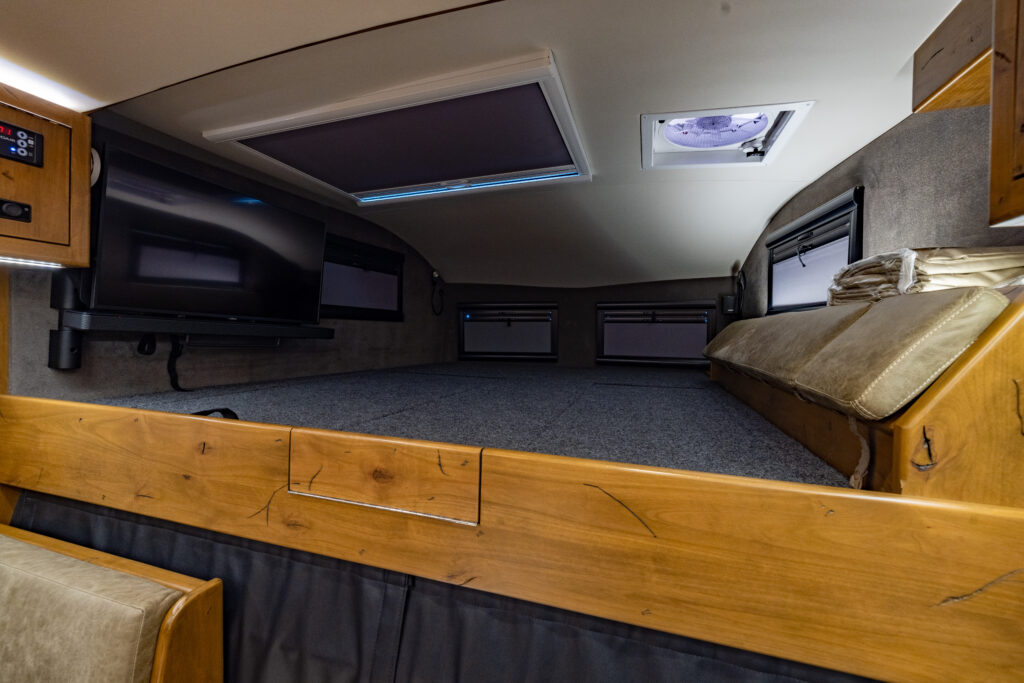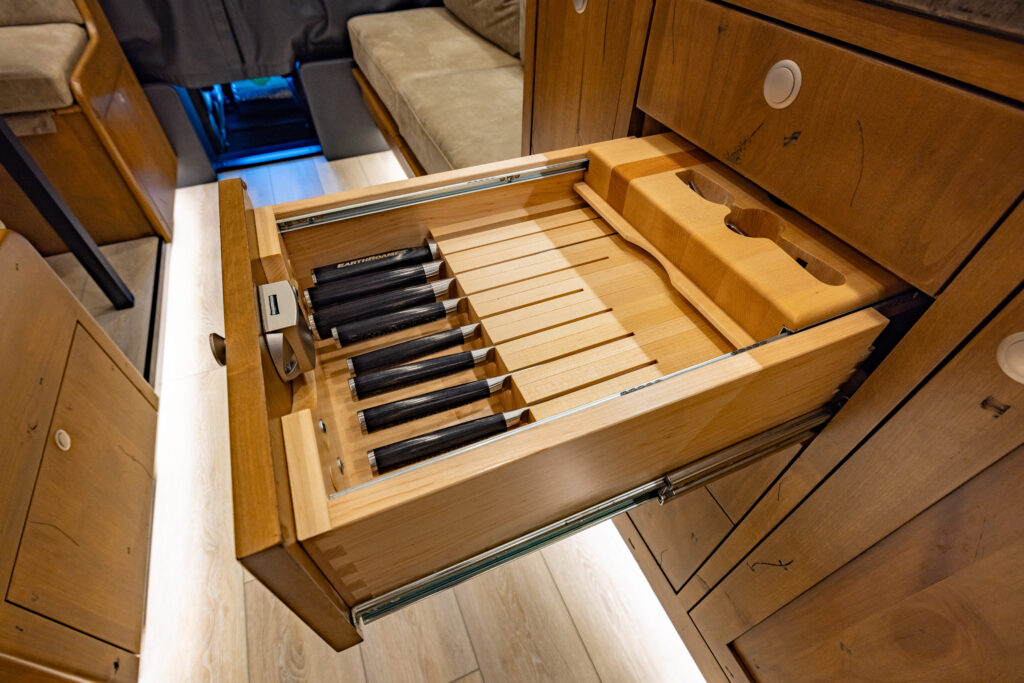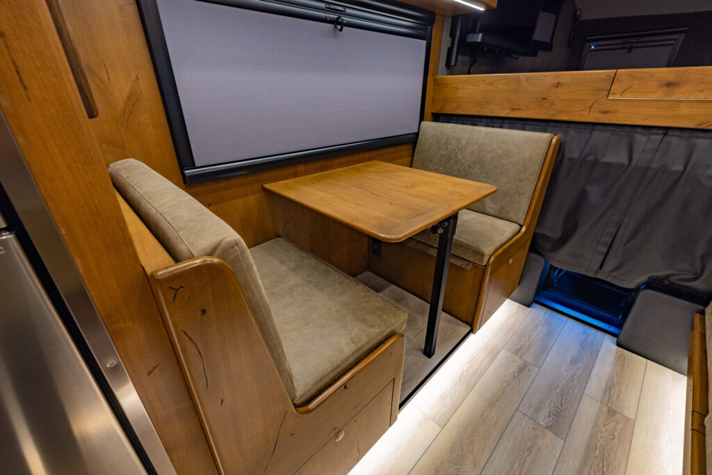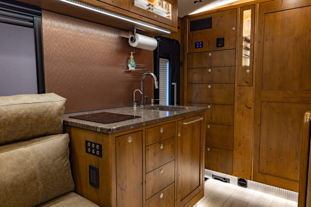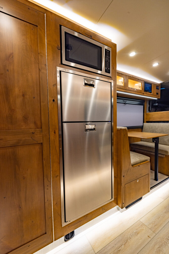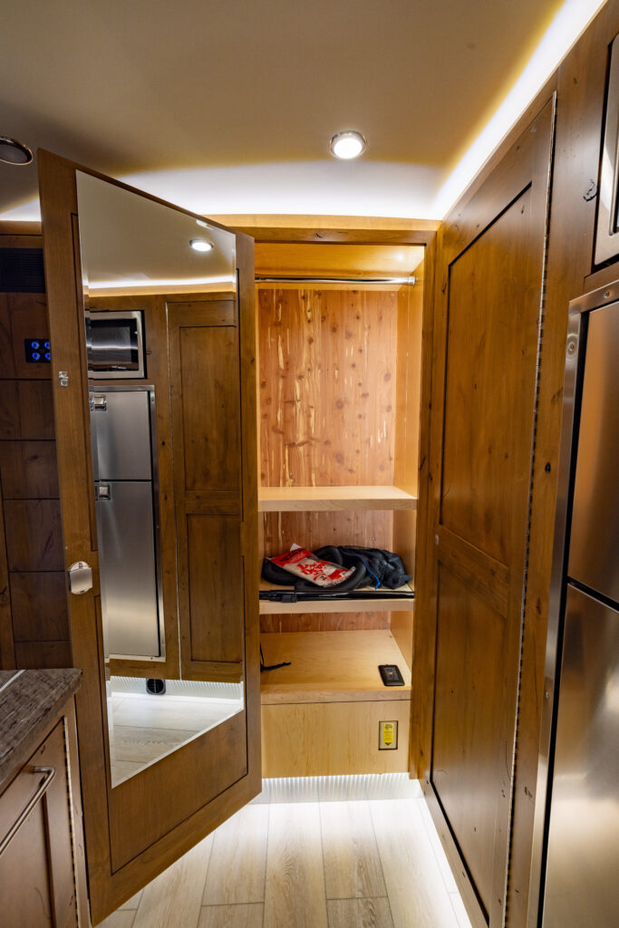 This 2021 XV-LTi is ready for it’s new home! The luxury interior of this EarthRoamer features Glazed Fawn Alder cabinetry laid out in the Breckenridge floor plan. LTi #28 feels like home on the inside with a central vacuum system, a 12-piece set of EarthRoamer nesting induction cookware, wine rack, and an electric induction cooktop.