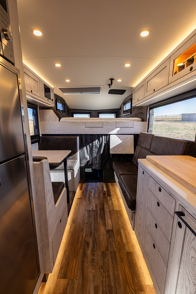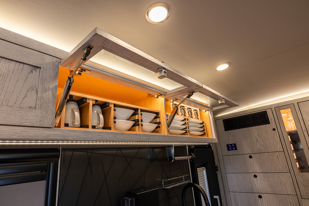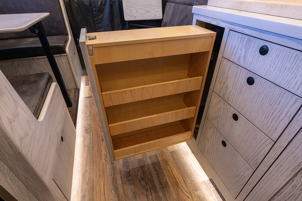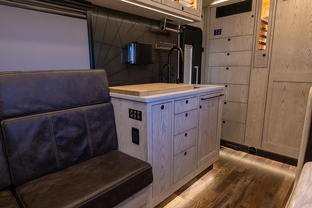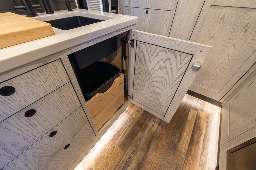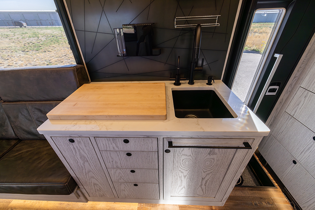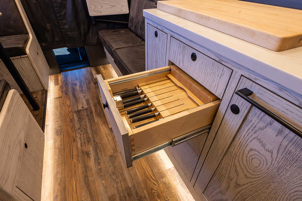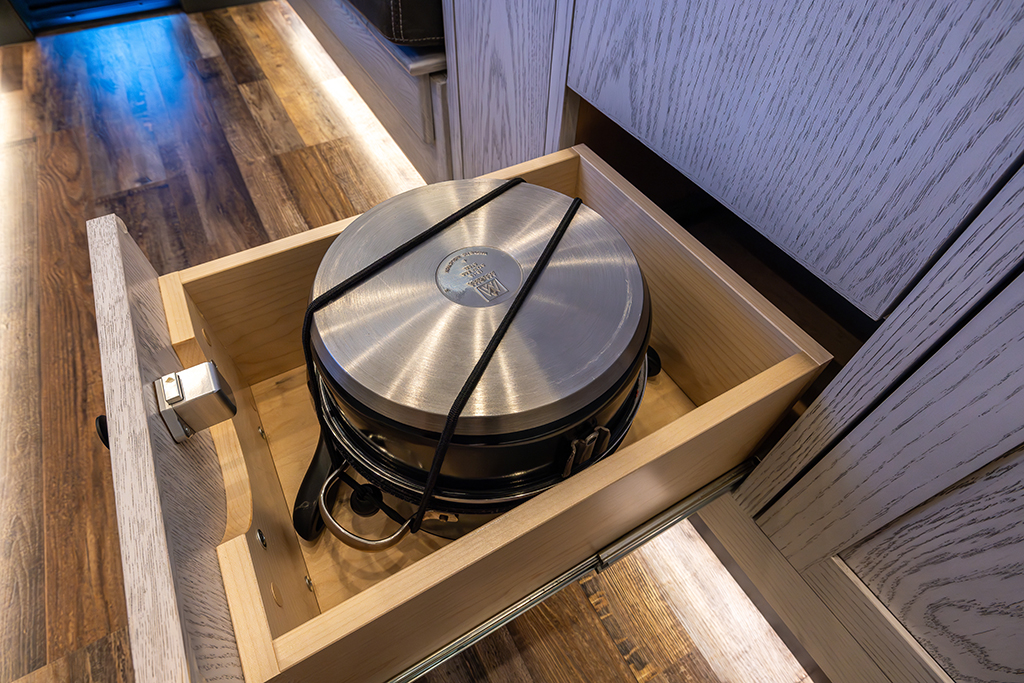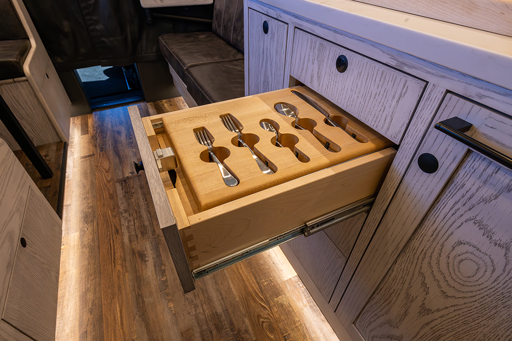 This 2023 XV-LTi is ready for it’s new home! The luxury interior of this EarthRoamer features Mist (Greywash Oak) cabinetry laid out in the Breckenridge floor plan. LTi-116 feels like home on the inside with a 12-piece set of EarthRoamer nesting induction cookware, EarthRoamer Logo Dinnerware, glasses, mugs, and silverware with custom quiet-ride storage organizers, and a two burner electric induction cooktop.