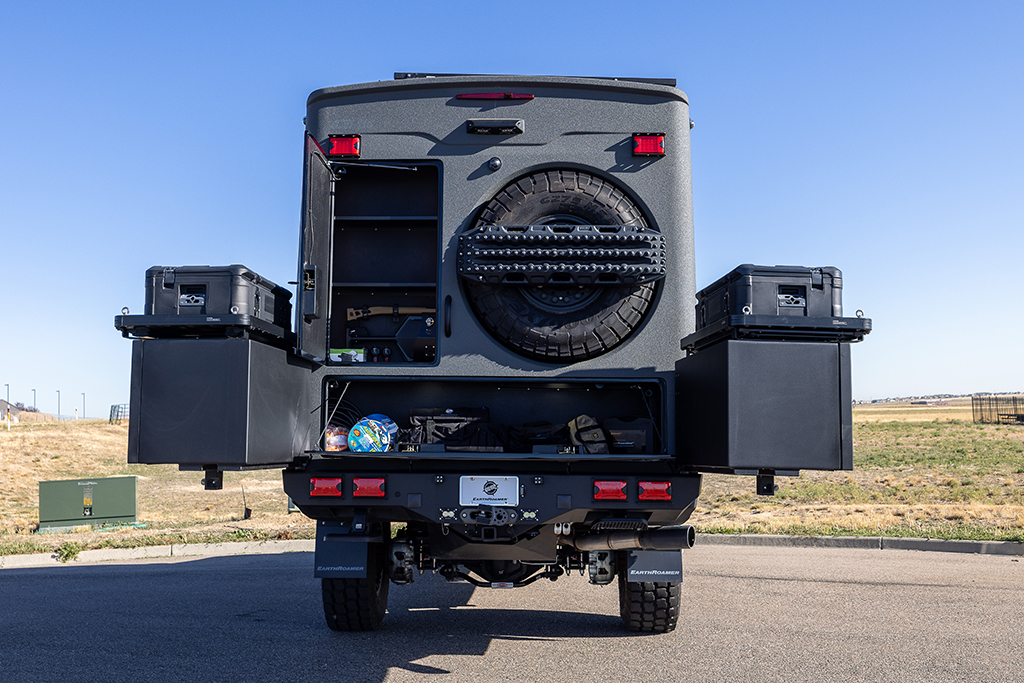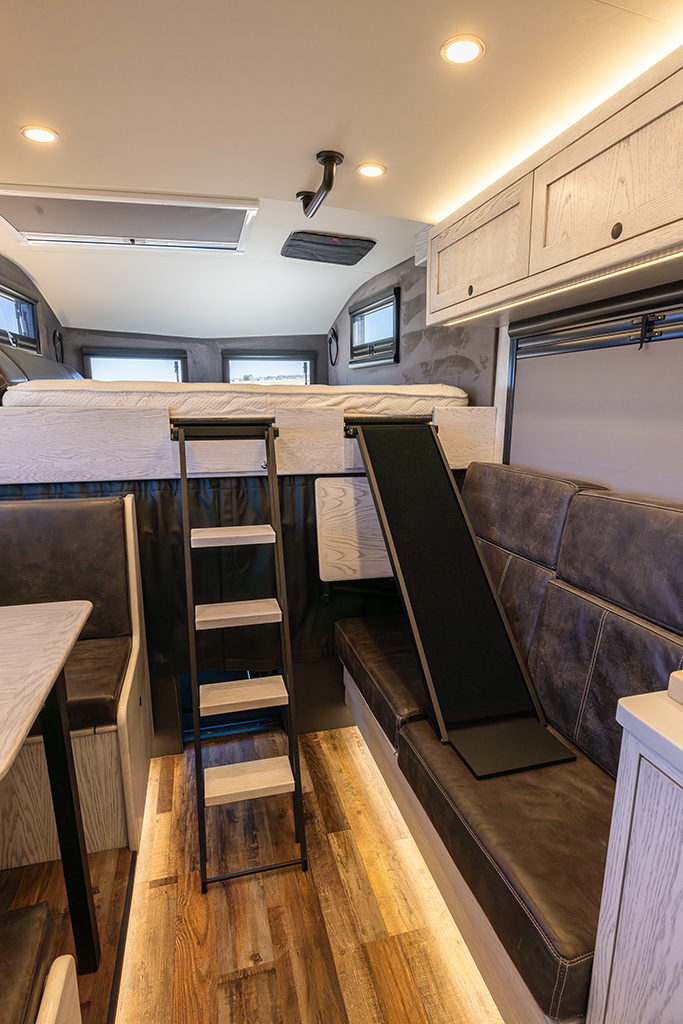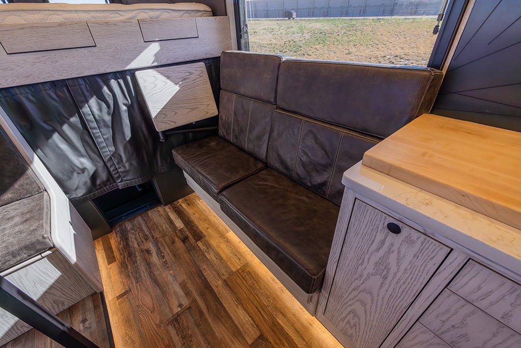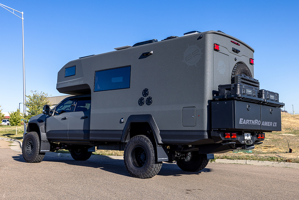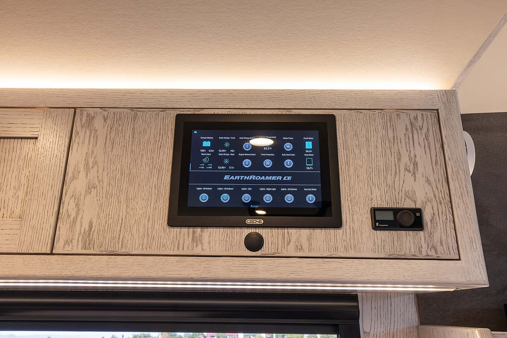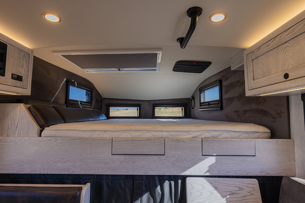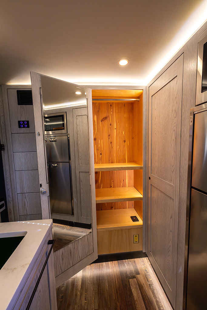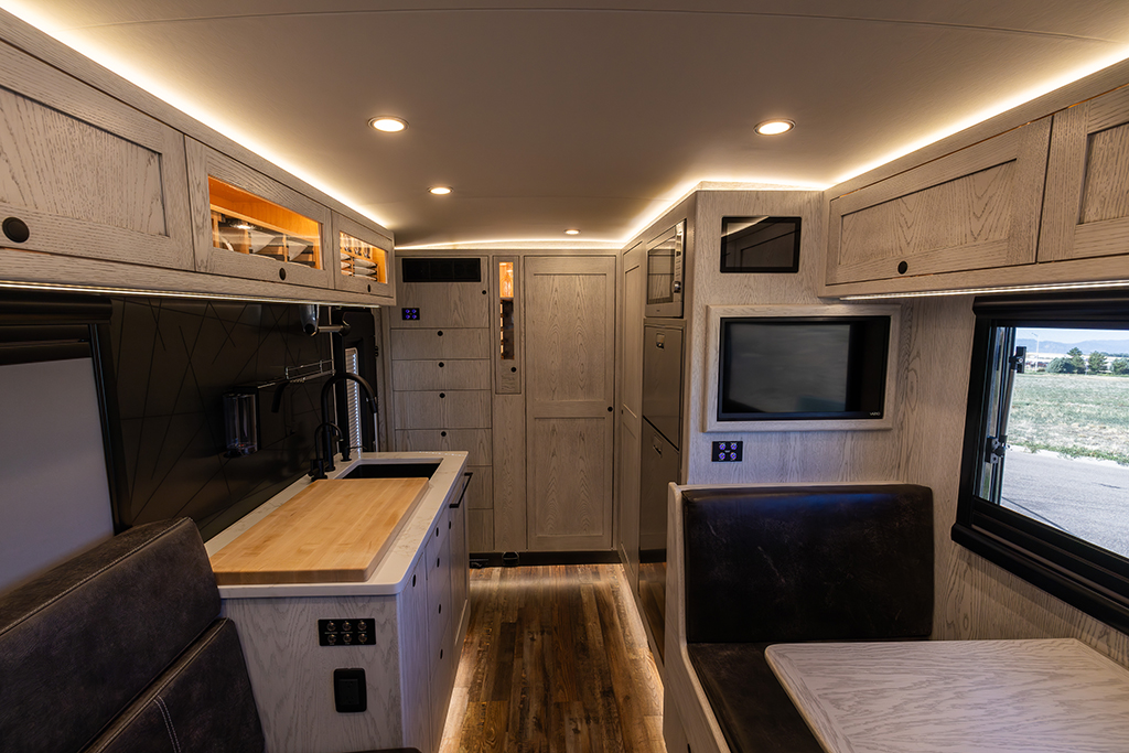 This 2023 XV-LTi is ready for it’s new home! The luxury interior of this EarthRoamer features Mist (Greywash Oak) cabinetry laid out in the Breckenridge floor plan. LTi-116 feels like home on the inside with a 12-piece set of EarthRoamer nesting induction cookware, EarthRoamer Logo Dinnerware, glasses, mugs, and silverware with custom quiet-ride storage organizers, and a two burner electric induction cooktop.