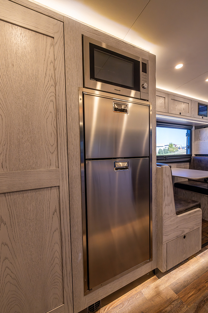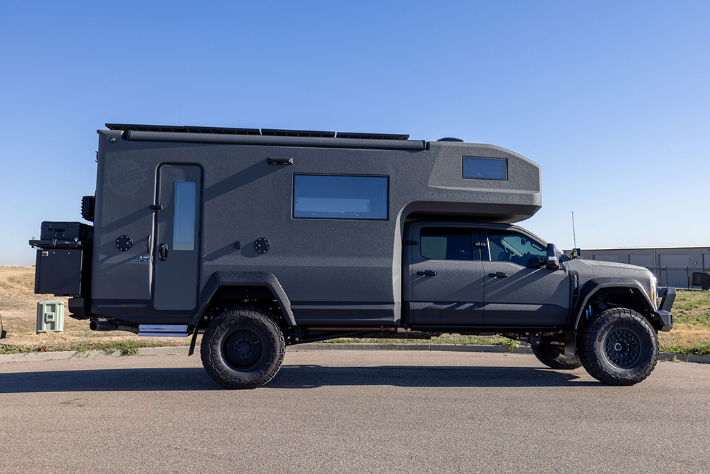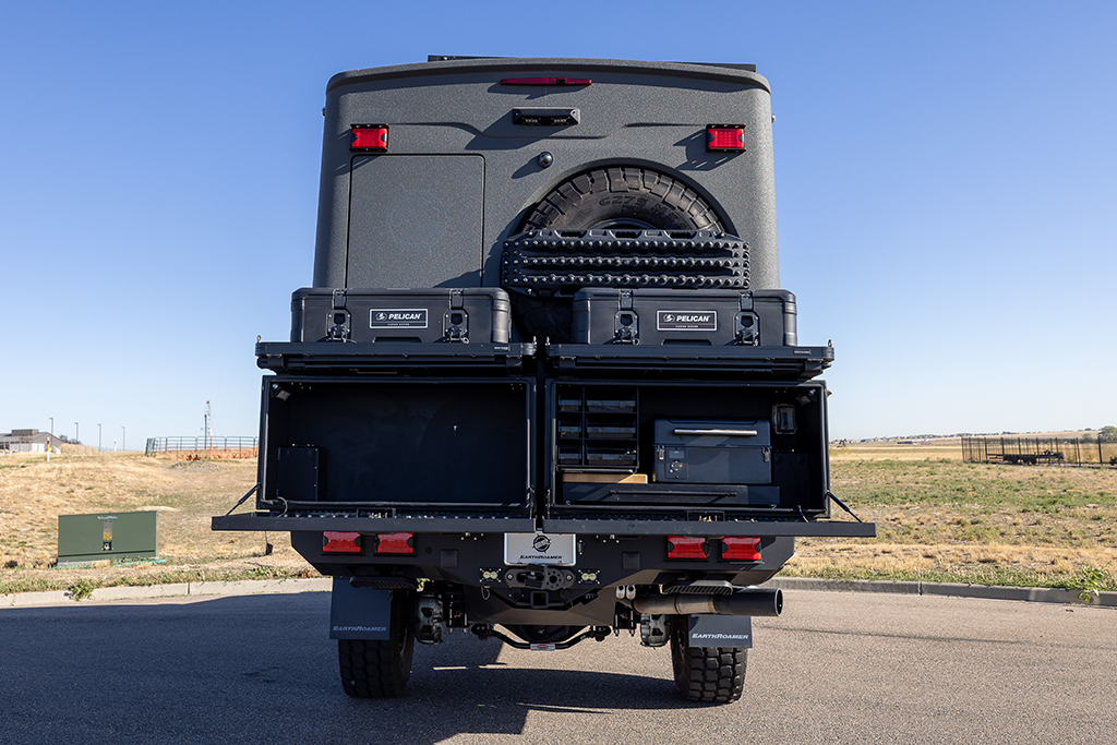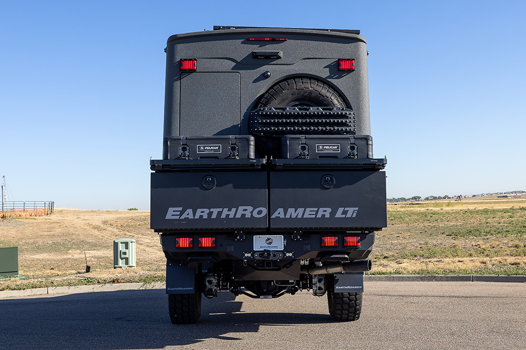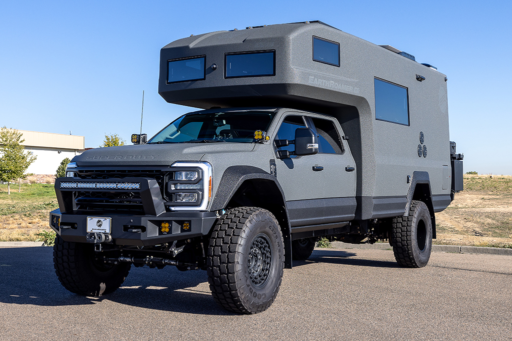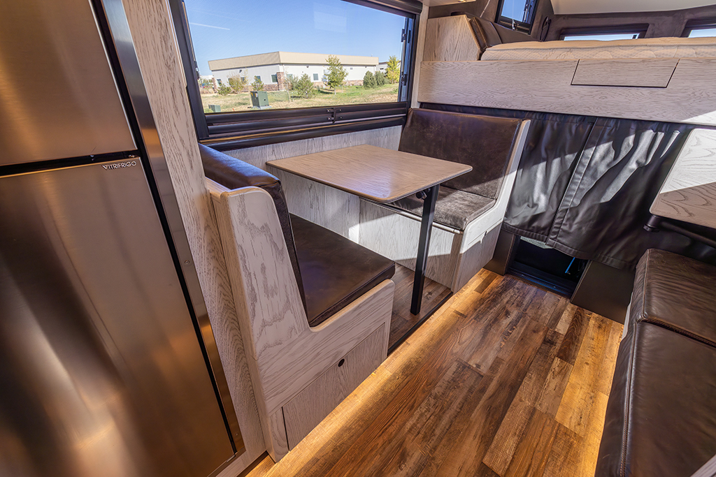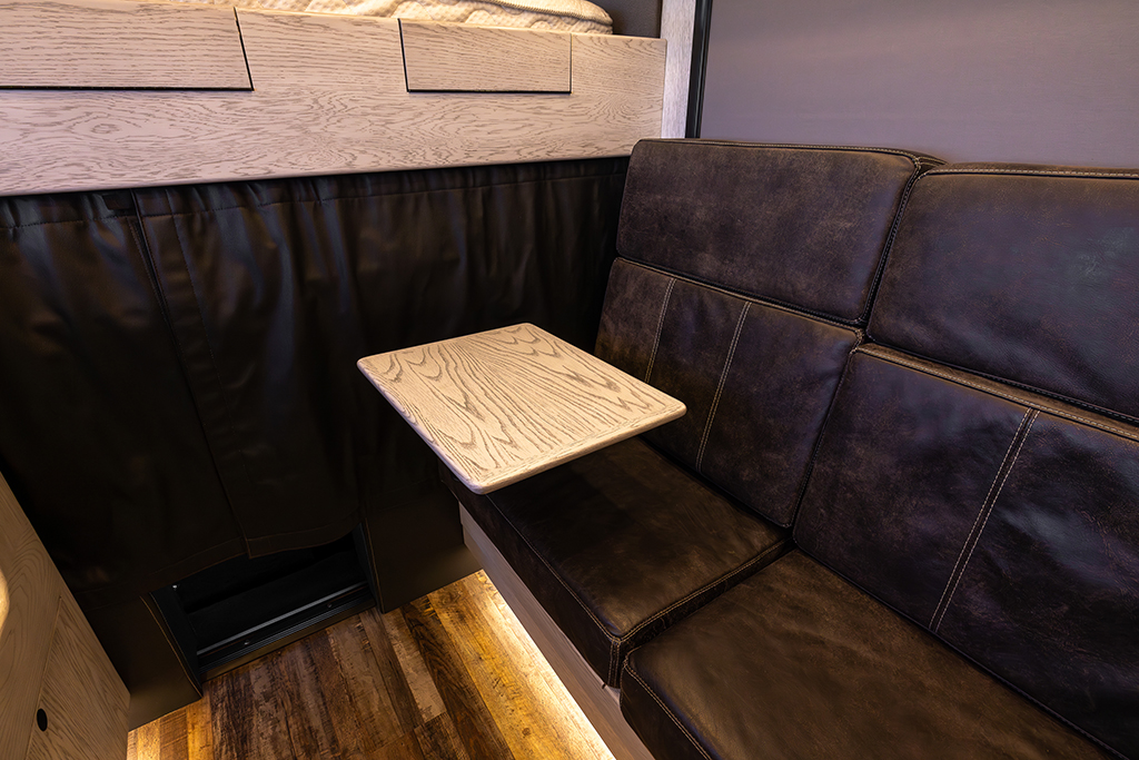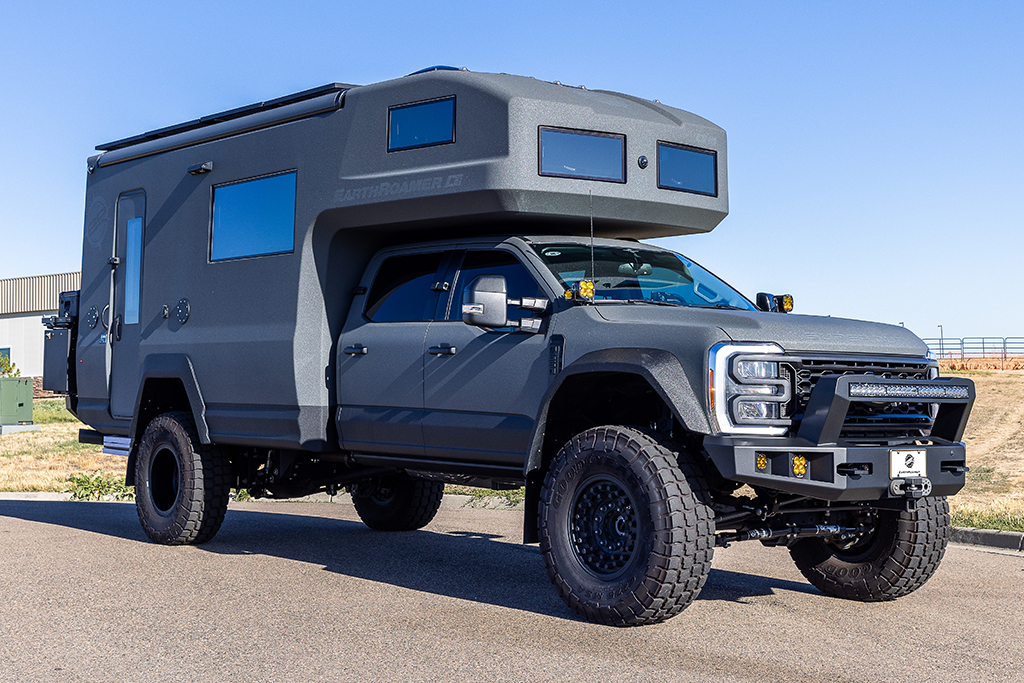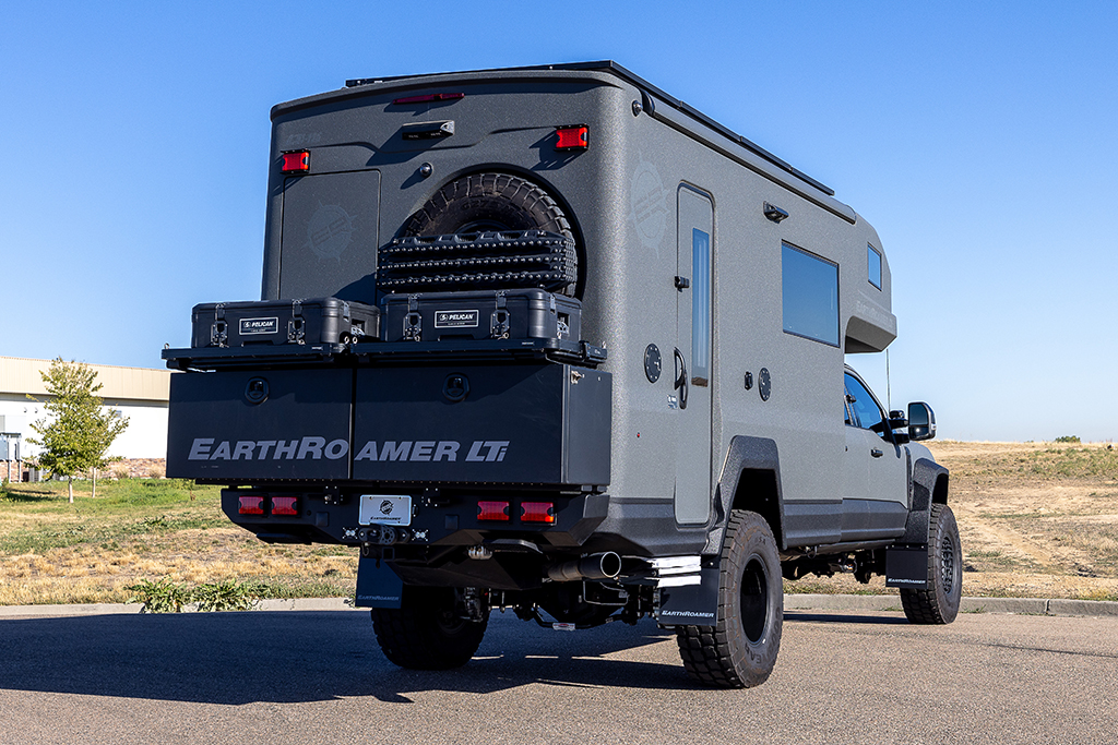 This 2023 XV-LTi is ready for it’s new home! The luxury interior of this EarthRoamer features Mist (Greywash Oak) cabinetry laid out in the Breckenridge floor plan. LTi-116 feels like home on the inside with a 12-piece set of EarthRoamer nesting induction cookware, EarthRoamer Logo Dinnerware, glasses, mugs, and silverware with custom quiet-ride storage organizers, and a two burner electric induction cooktop.