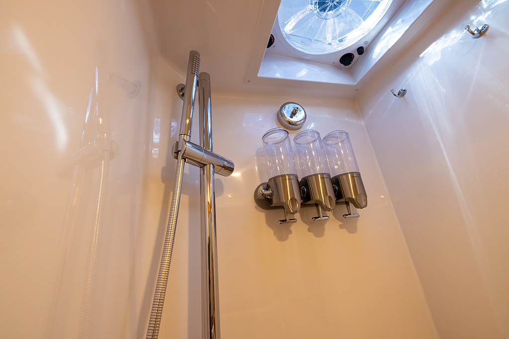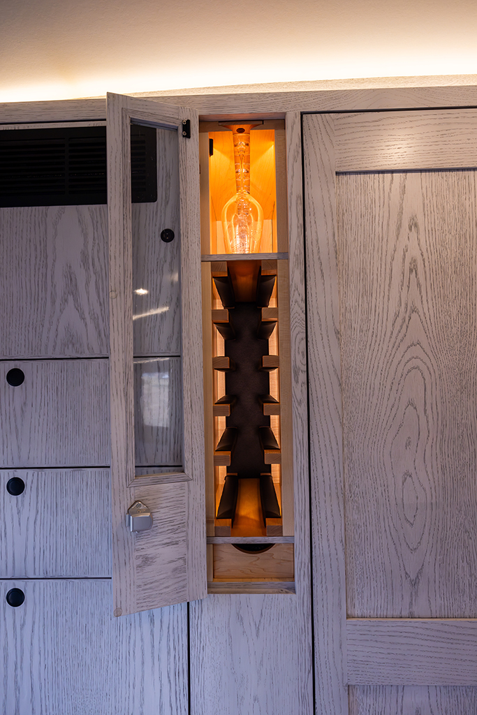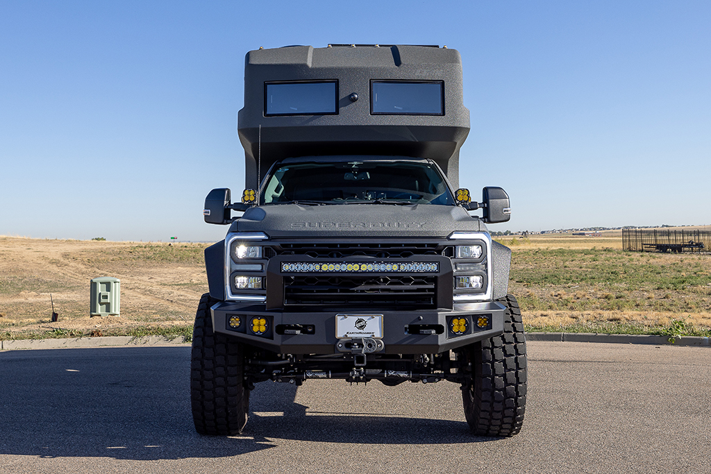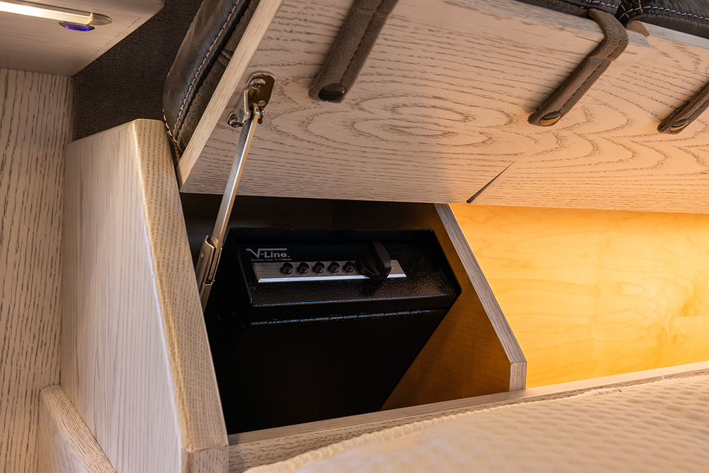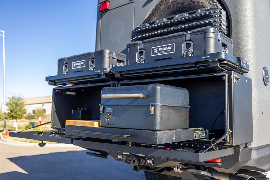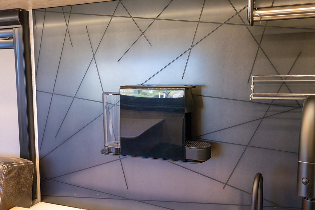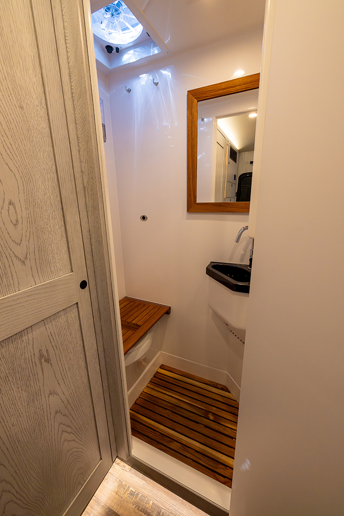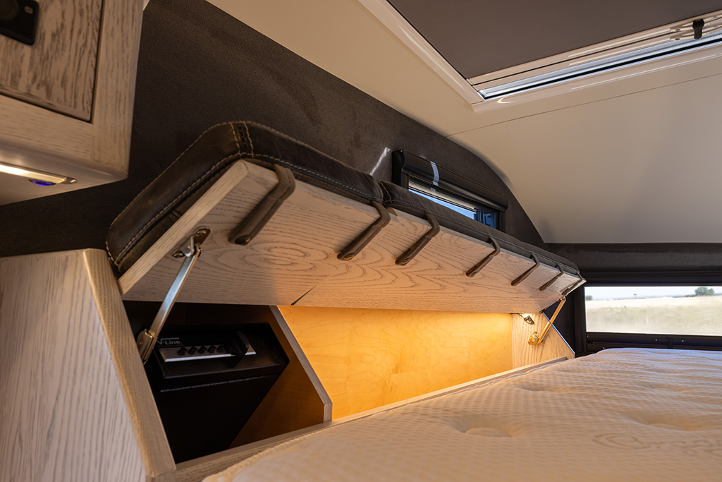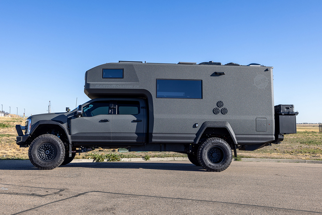 This 2023 XV-LTi is ready for it’s new home! The luxury interior of this EarthRoamer features Mist (Greywash Oak) cabinetry laid out in the Breckenridge floor plan. LTi-116 feels like home on the inside with a 12-piece set of EarthRoamer nesting induction cookware, EarthRoamer Logo Dinnerware, glasses, mugs, and silverware with custom quiet-ride storage organizers, and a two burner electric induction cooktop.