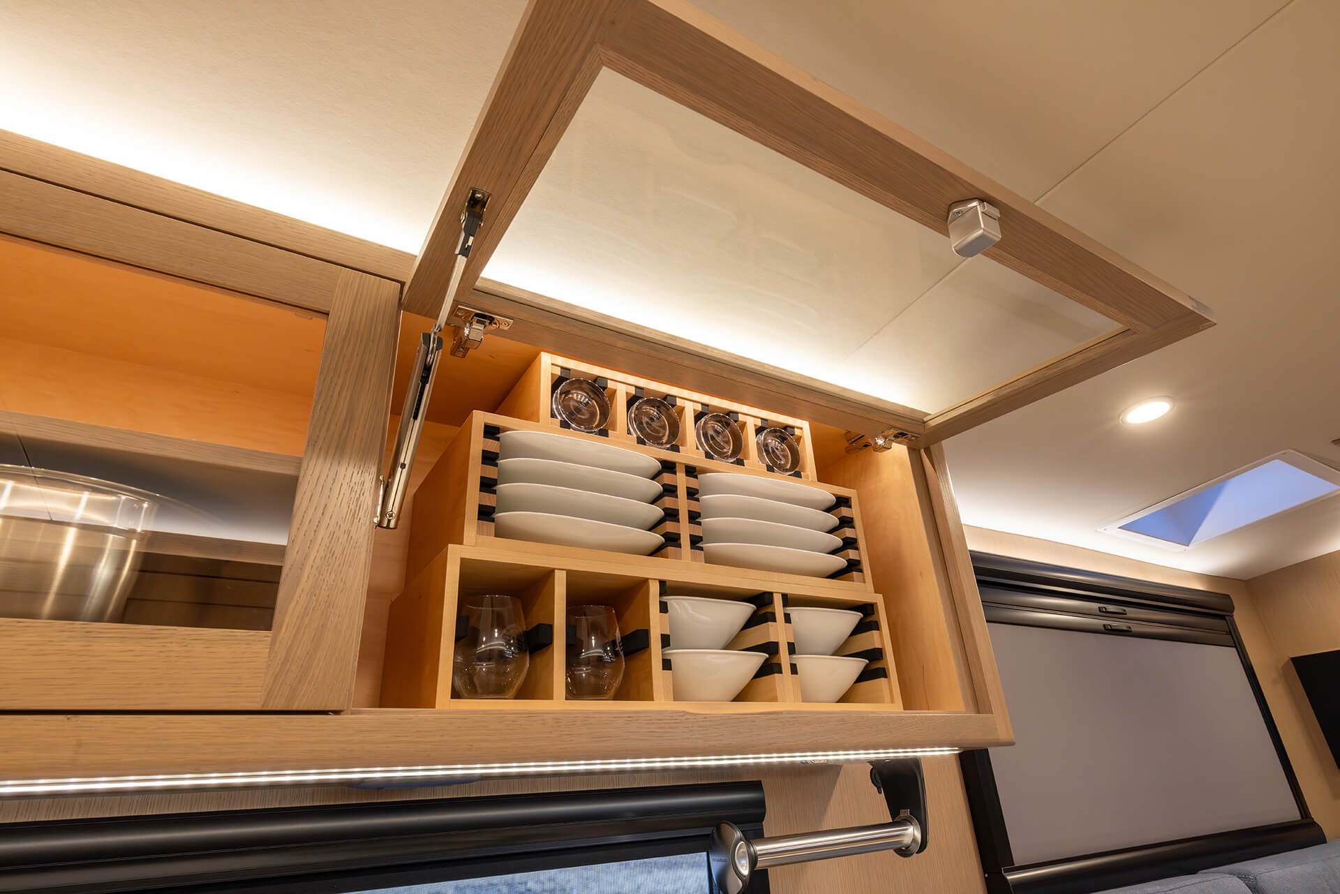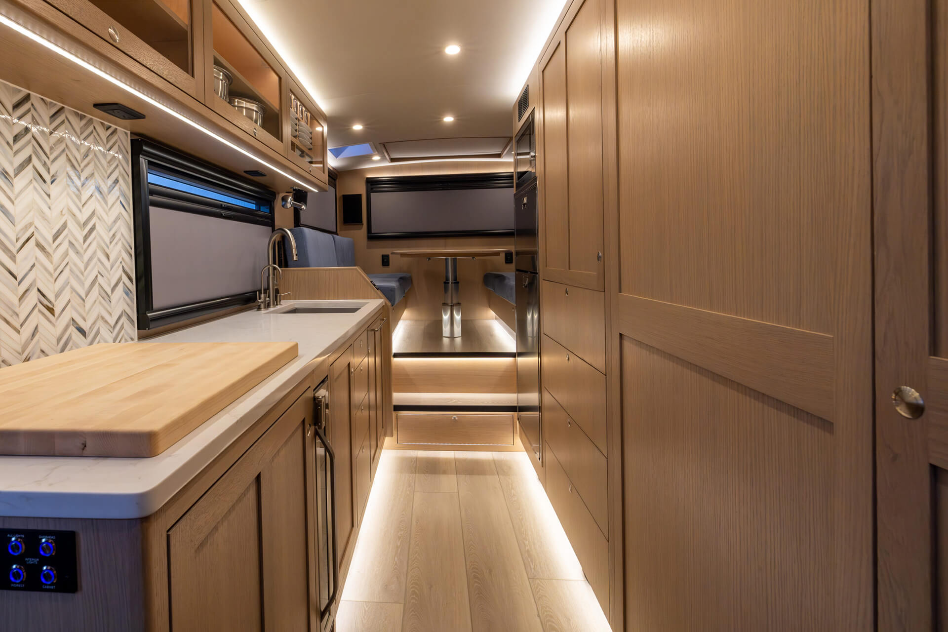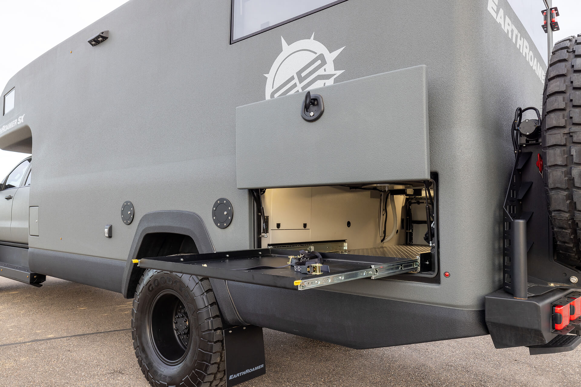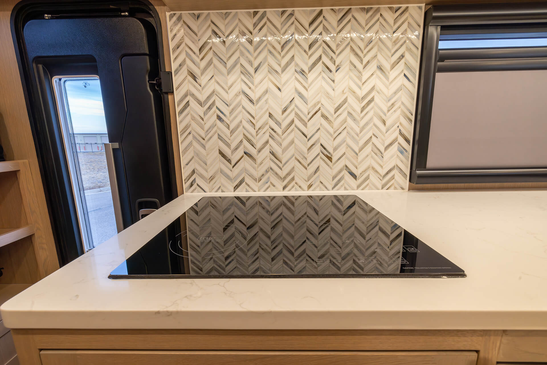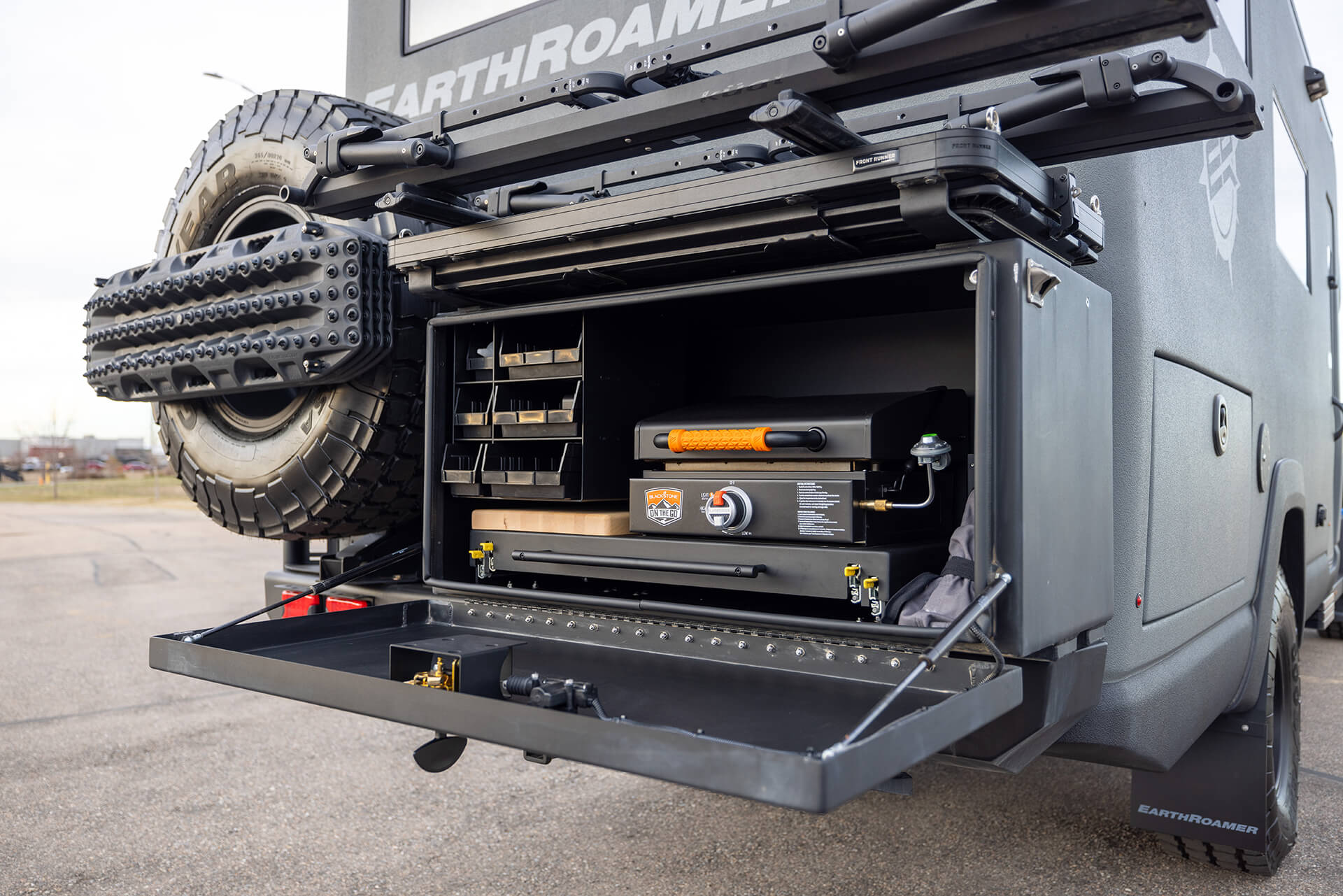 This 2024 XV-SX is ready to start traveling the country! The luxury interior of this EarthRoamer features custom Rift Oak cabinetry laid out in the Mount Shavano floor plan. SX-014 feels like home on the inside with a 12-piece set of EarthRoamer nesting induction cookware, EarthRoamer Logo Dinnerware, glasses, mugs, and silverware with custom quiet-ride storage organizers, and a three burner electric induction cooktop.