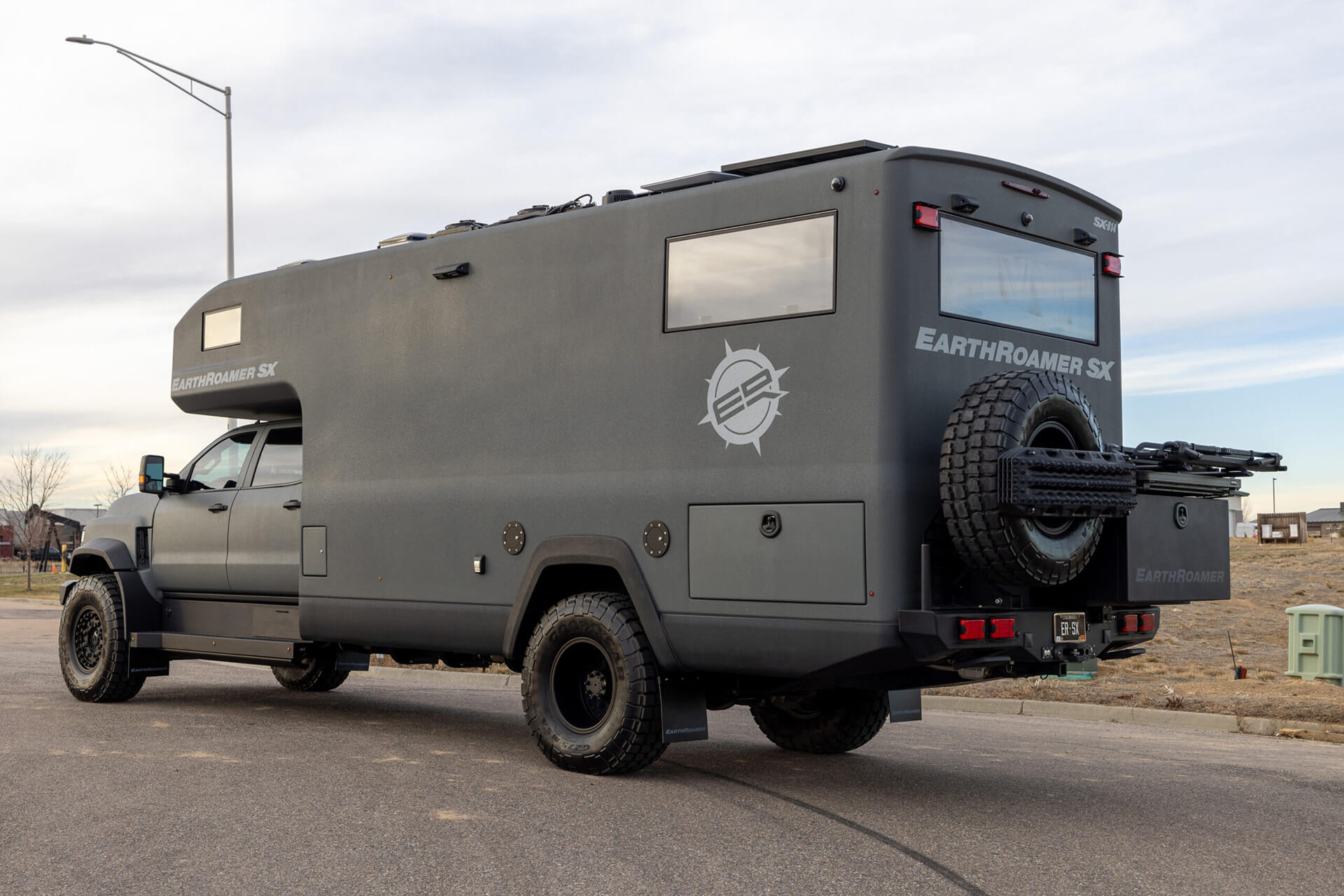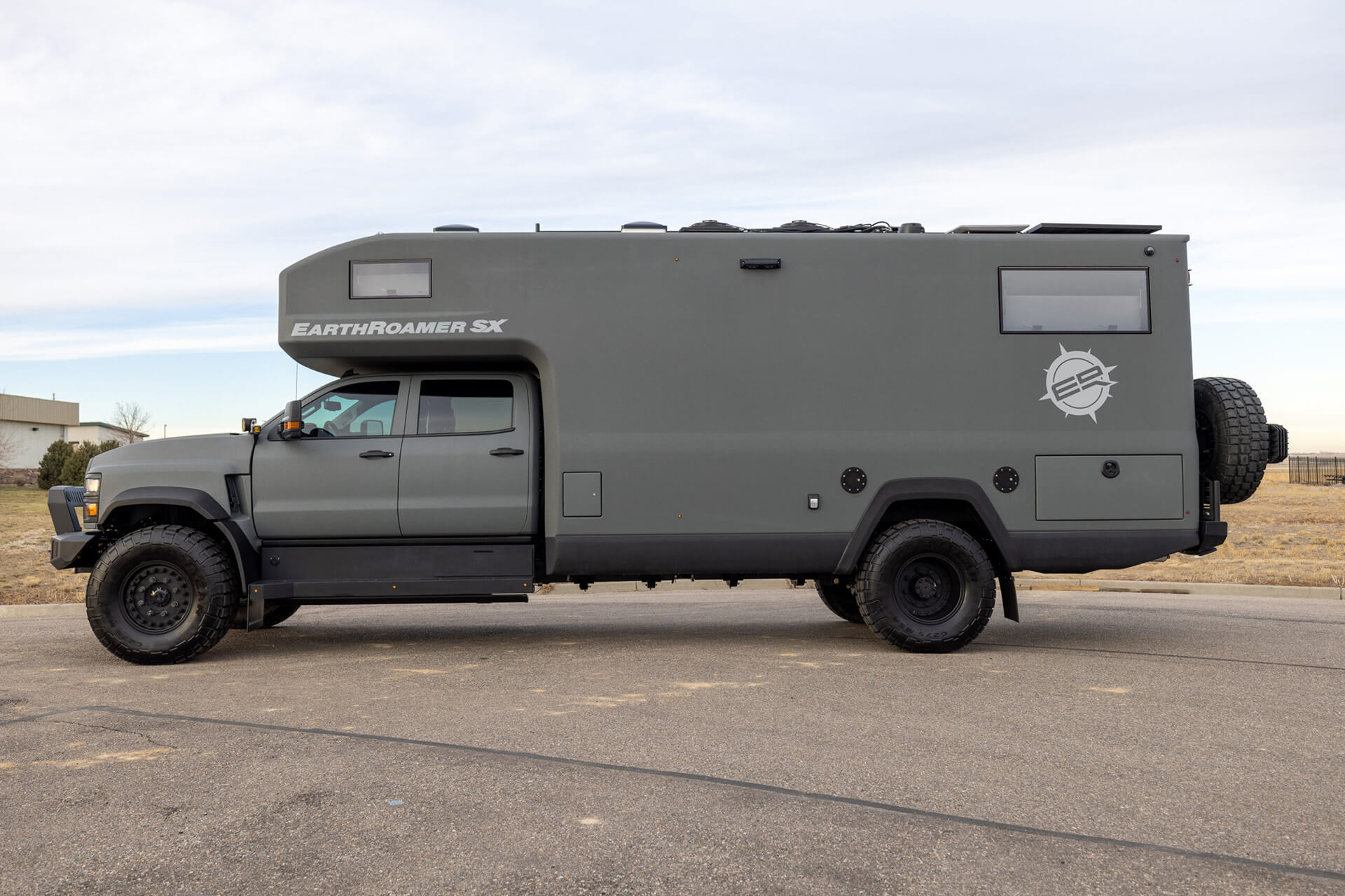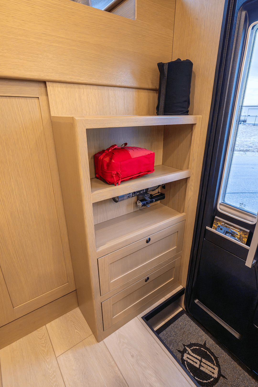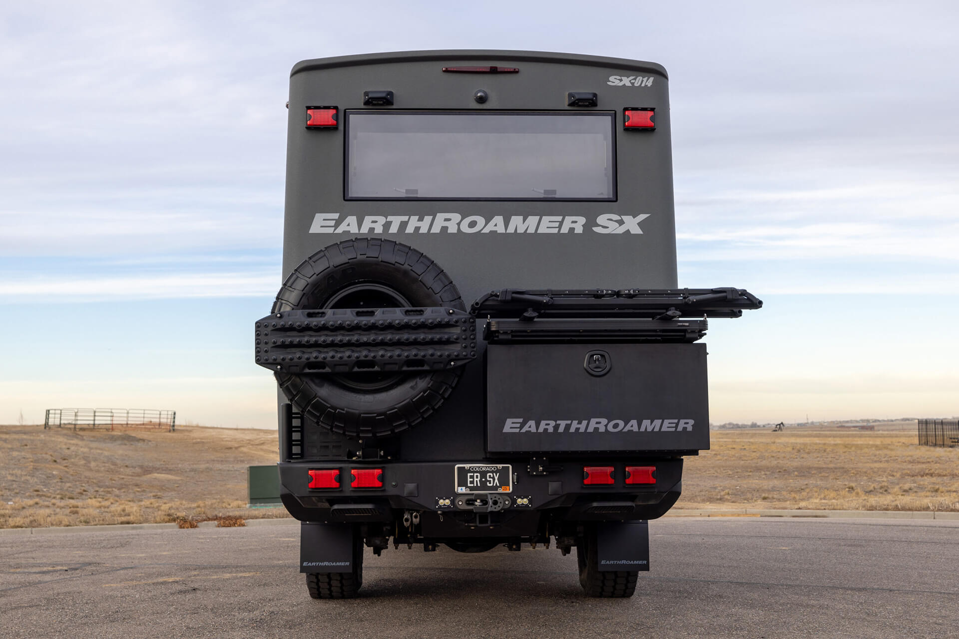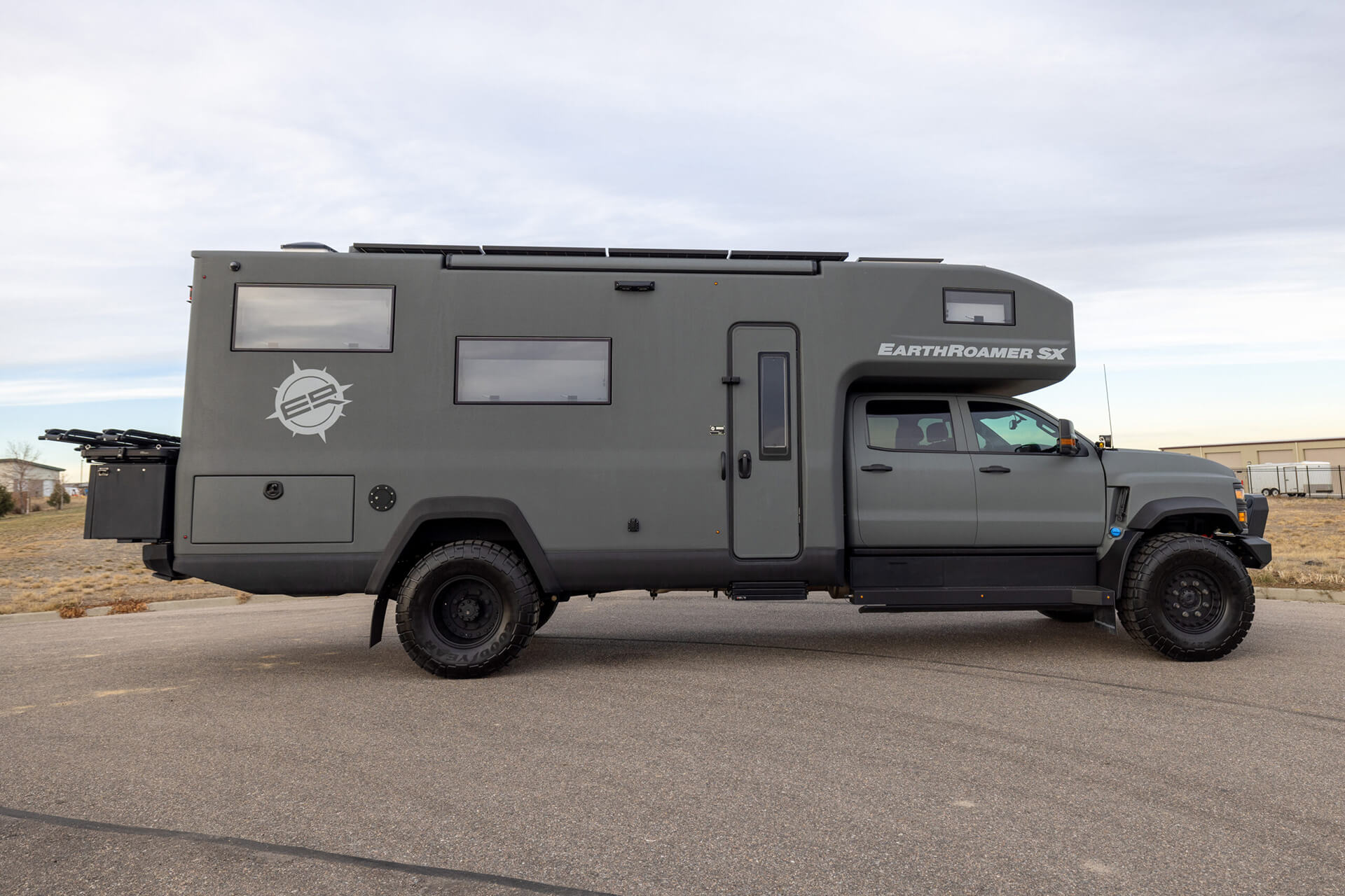 This 2024 XV-SX is ready to start traveling the country! The luxury interior of this EarthRoamer features custom Rift Oak cabinetry laid out in the Mount Shavano floor plan. SX-014 feels like home on the inside with a 12-piece set of EarthRoamer nesting induction cookware, EarthRoamer Logo Dinnerware, glasses, mugs, and silverware with custom quiet-ride storage organizers, and a three burner electric induction cooktop.