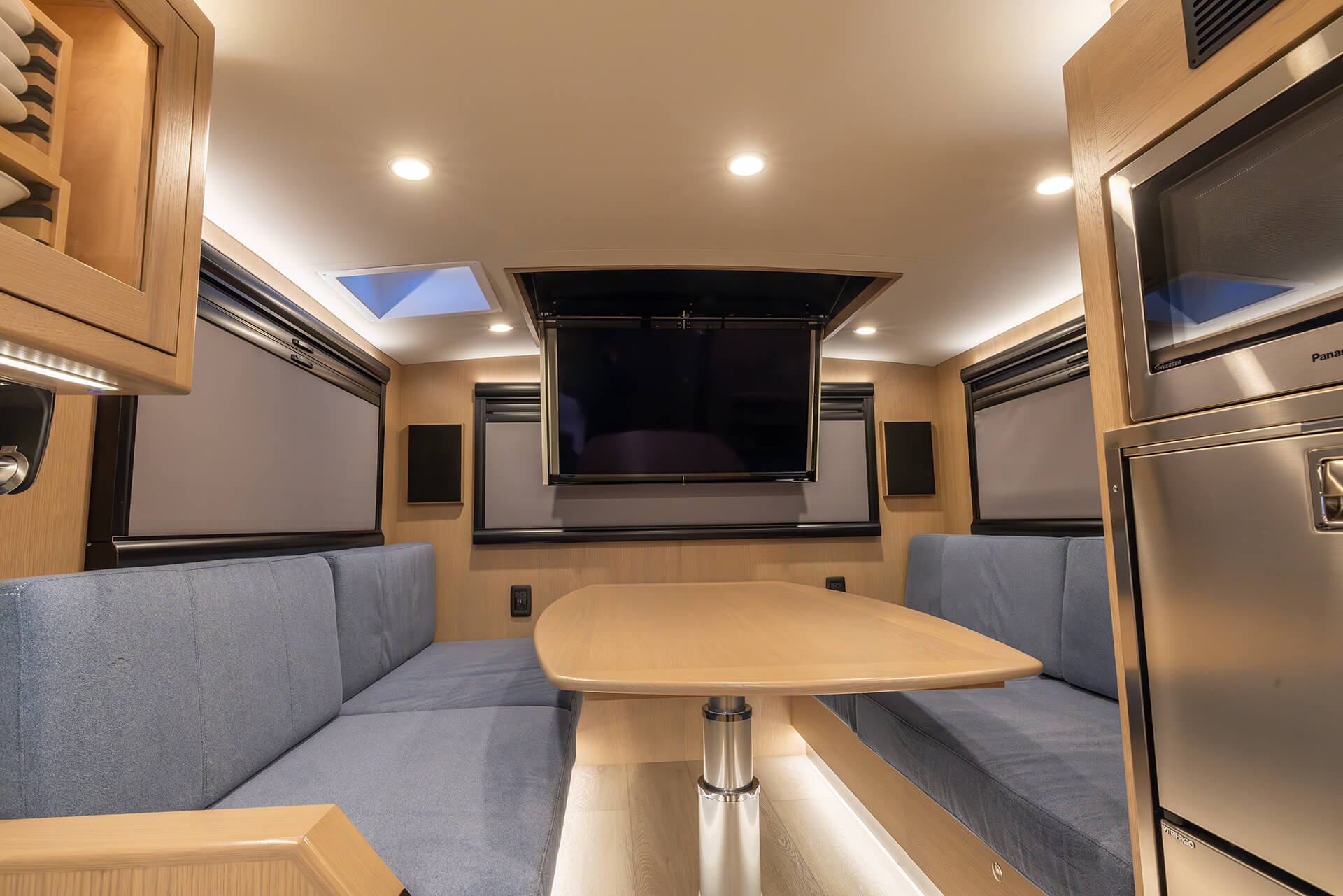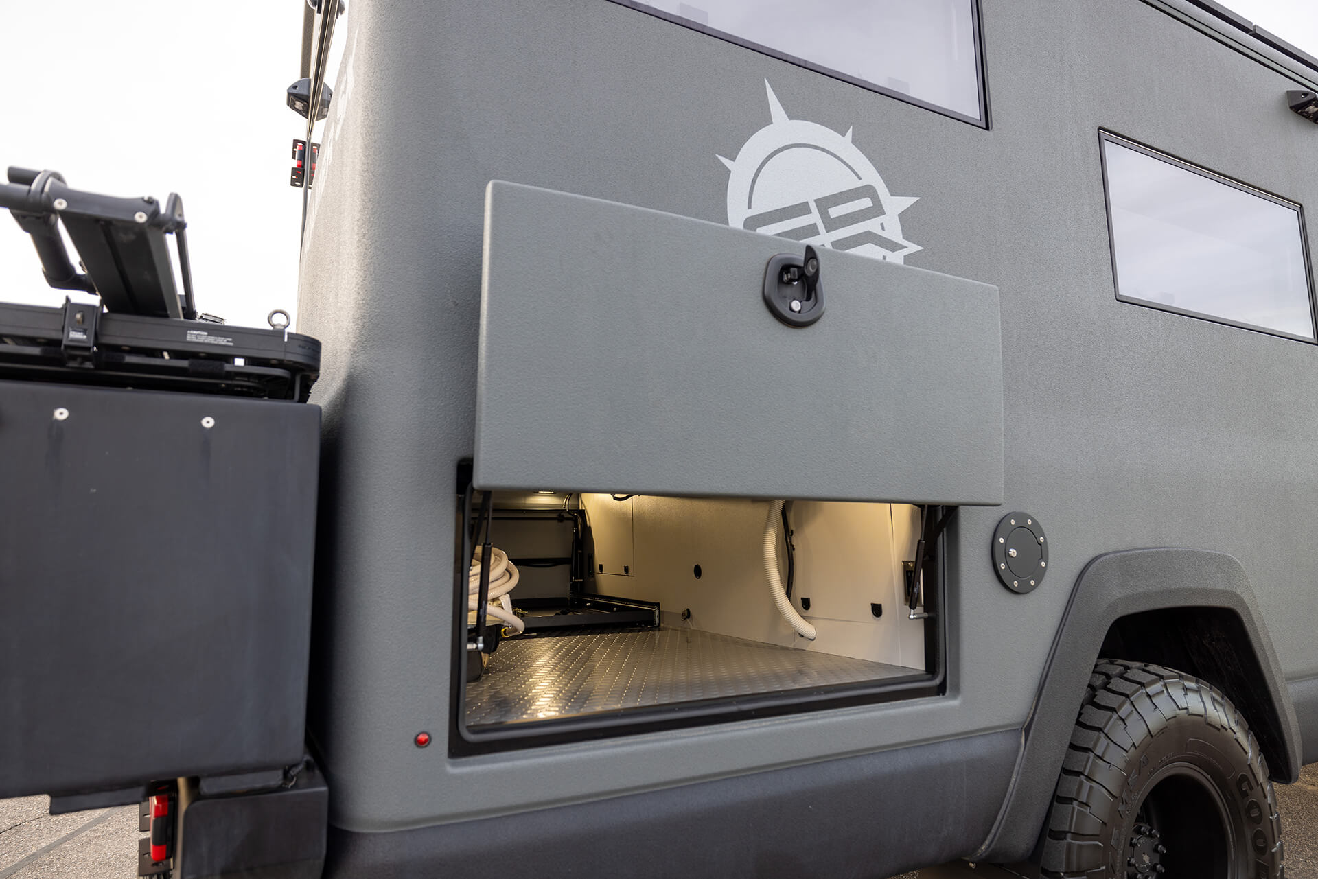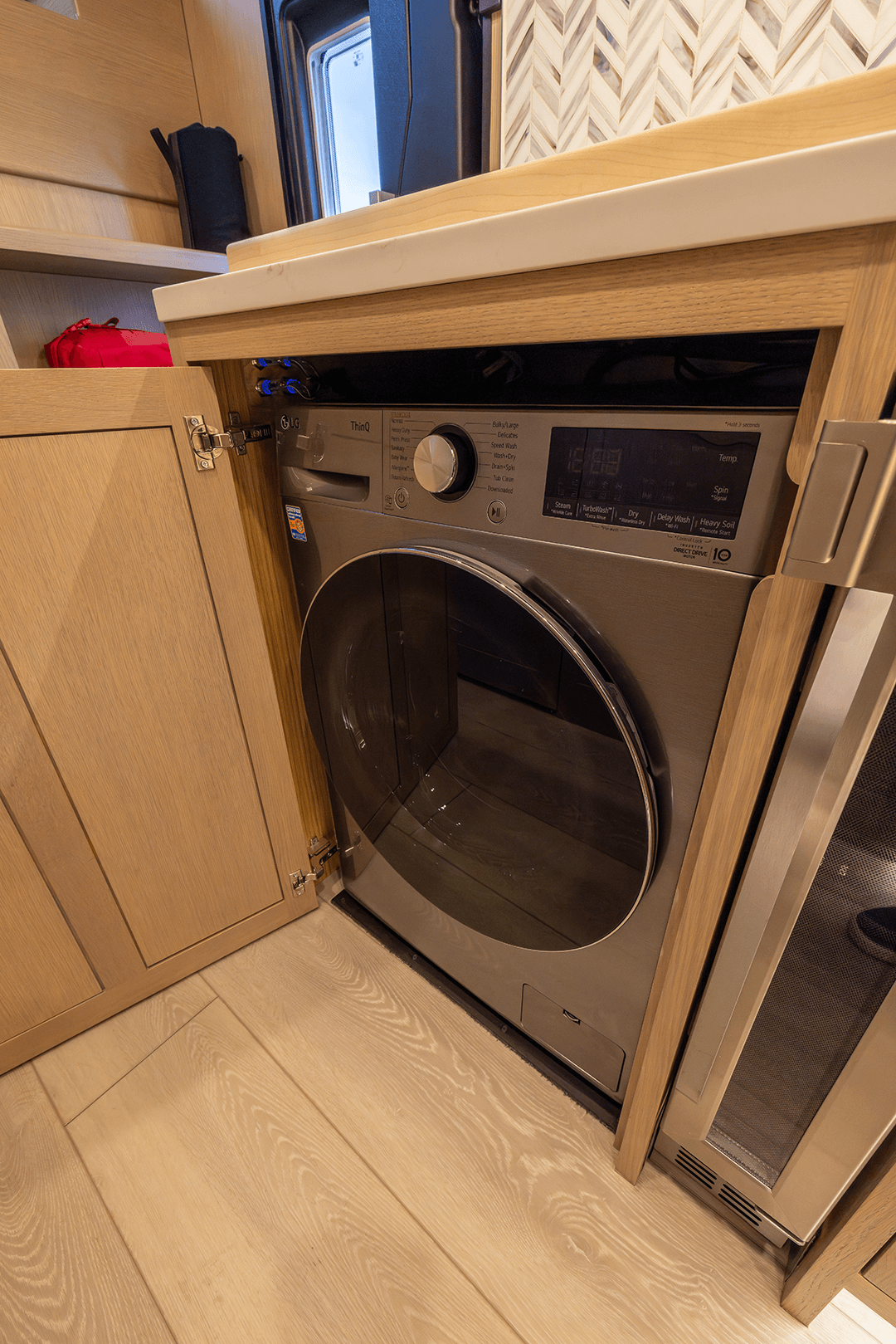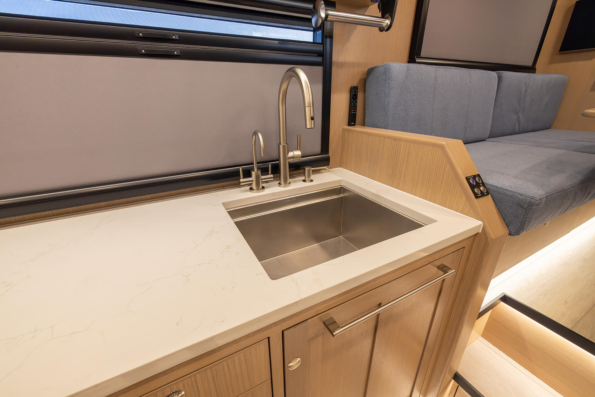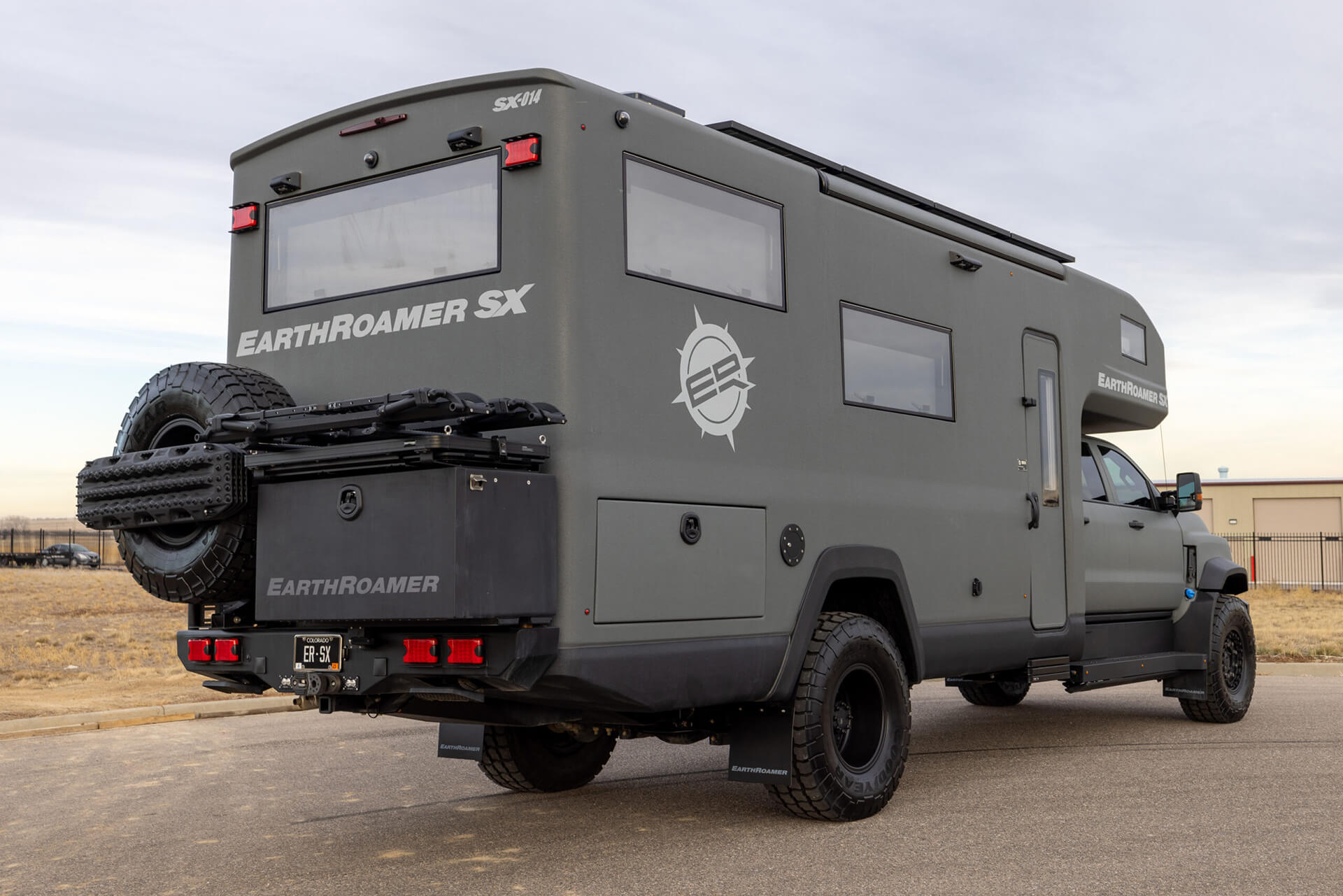 This 2024 XV-SX is ready to start traveling the country! The luxury interior of this EarthRoamer features custom Rift Oak cabinetry laid out in the Mount Shavano floor plan. SX-014 feels like home on the inside with a 12-piece set of EarthRoamer nesting induction cookware, EarthRoamer Logo Dinnerware, glasses, mugs, and silverware with custom quiet-ride storage organizers, and a three burner electric induction cooktop.