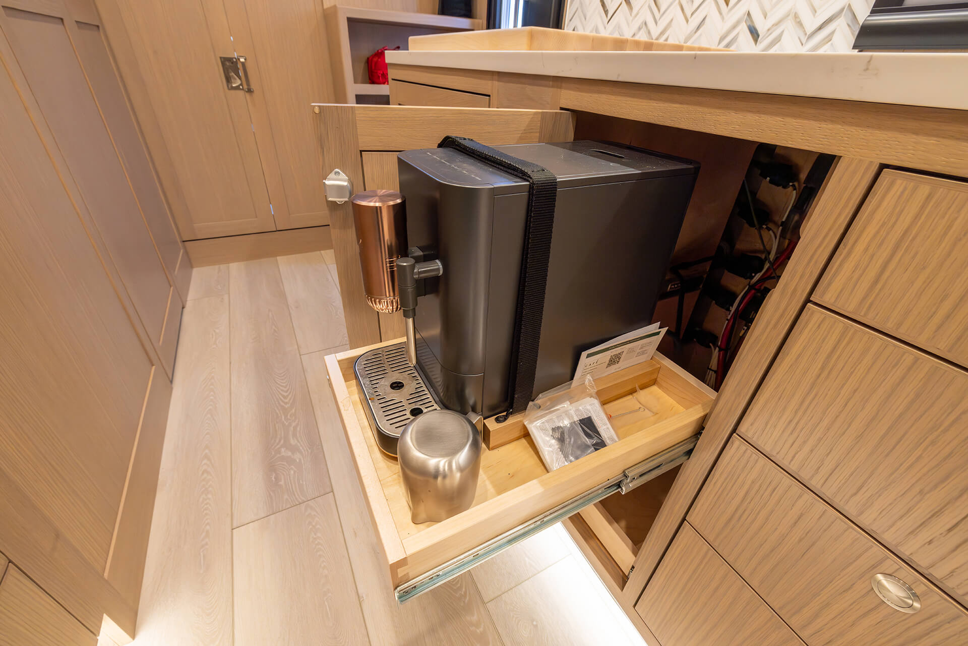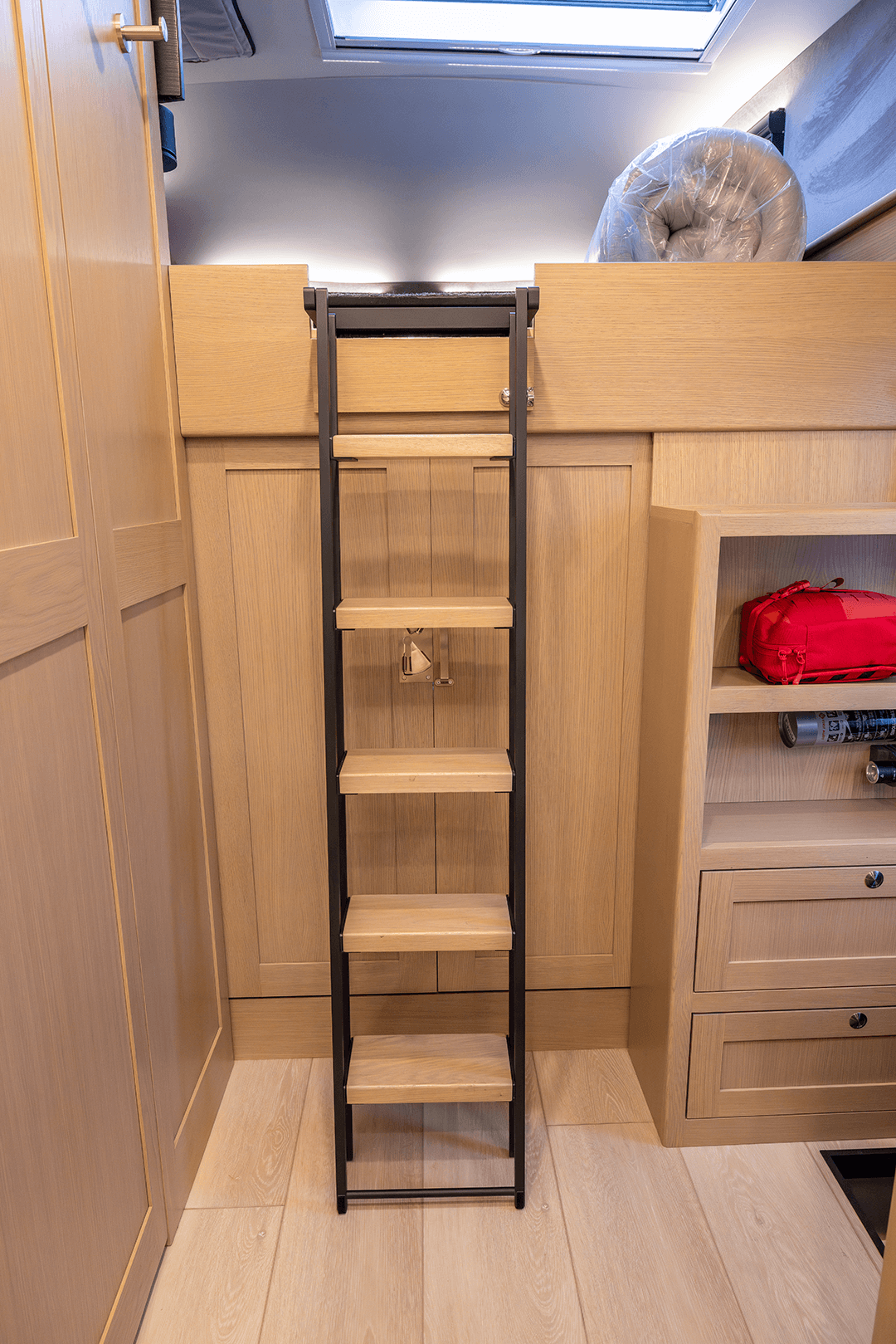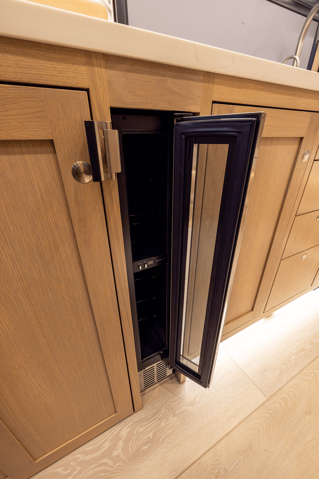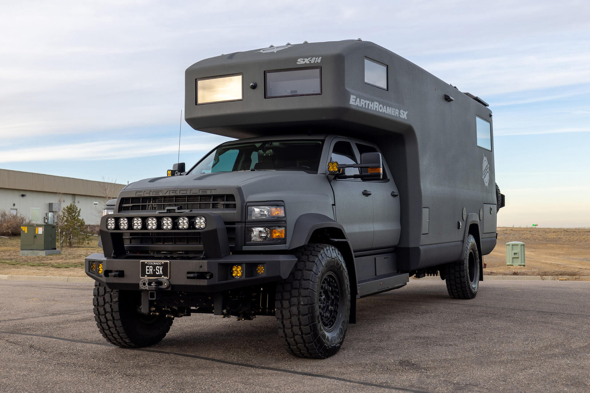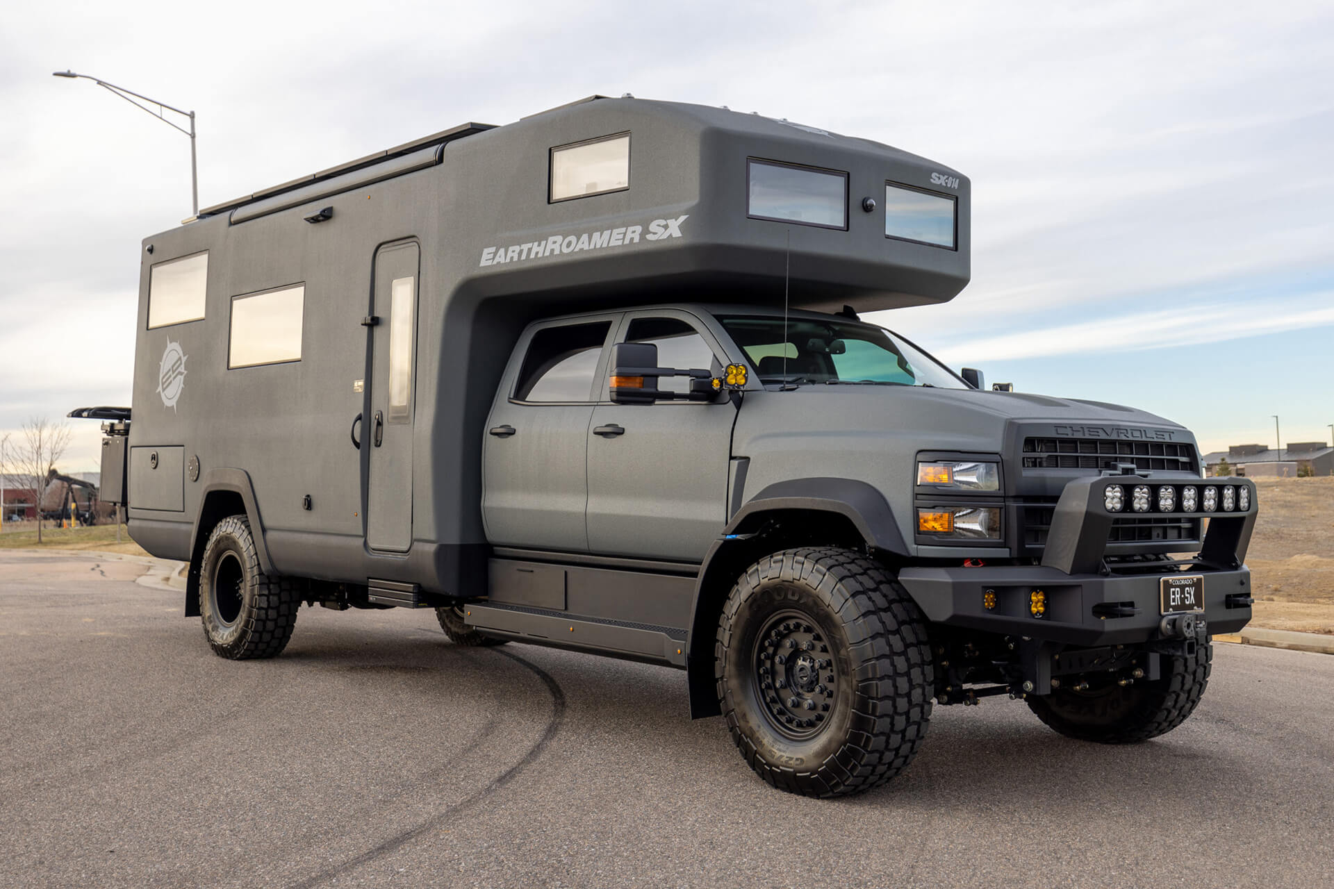 This 2024 XV-SX is ready to start traveling the country! The luxury interior of this EarthRoamer features custom Rift Oak cabinetry laid out in the Mount Shavano floor plan. SX-014 feels like home on the inside with a 12-piece set of EarthRoamer nesting induction cookware, EarthRoamer Logo Dinnerware, glasses, mugs, and silverware with custom quiet-ride storage organizers, and a three burner electric induction cooktop.