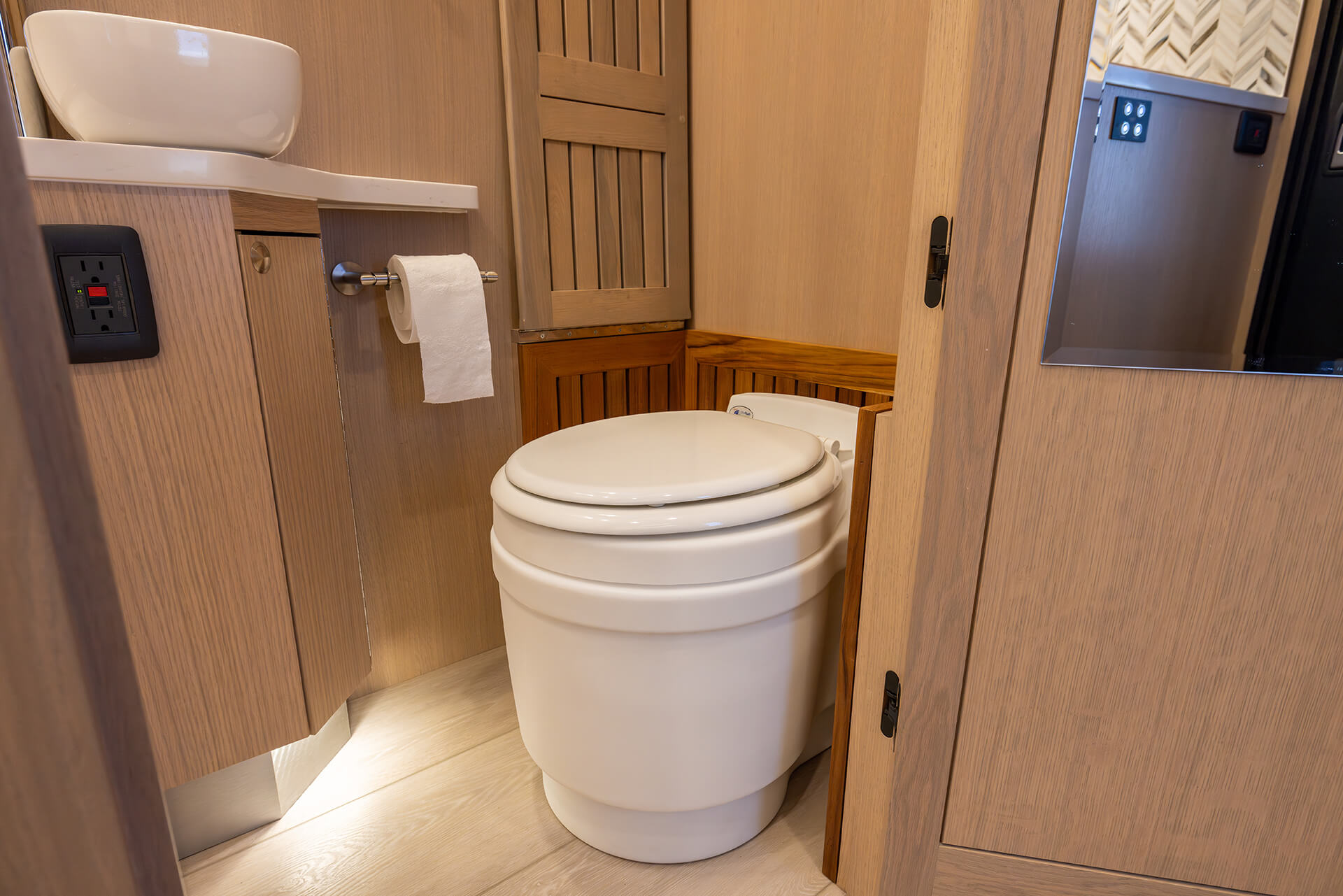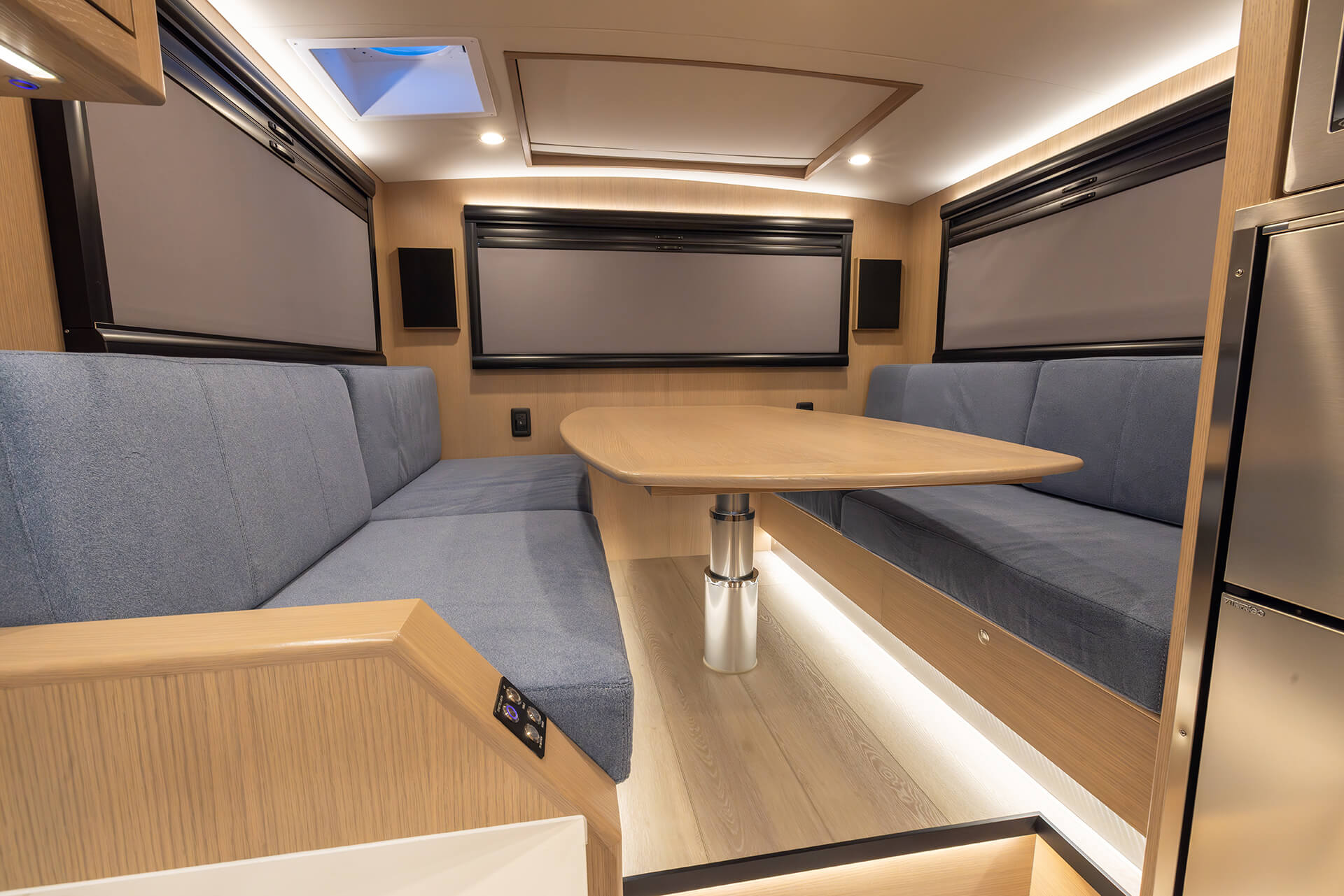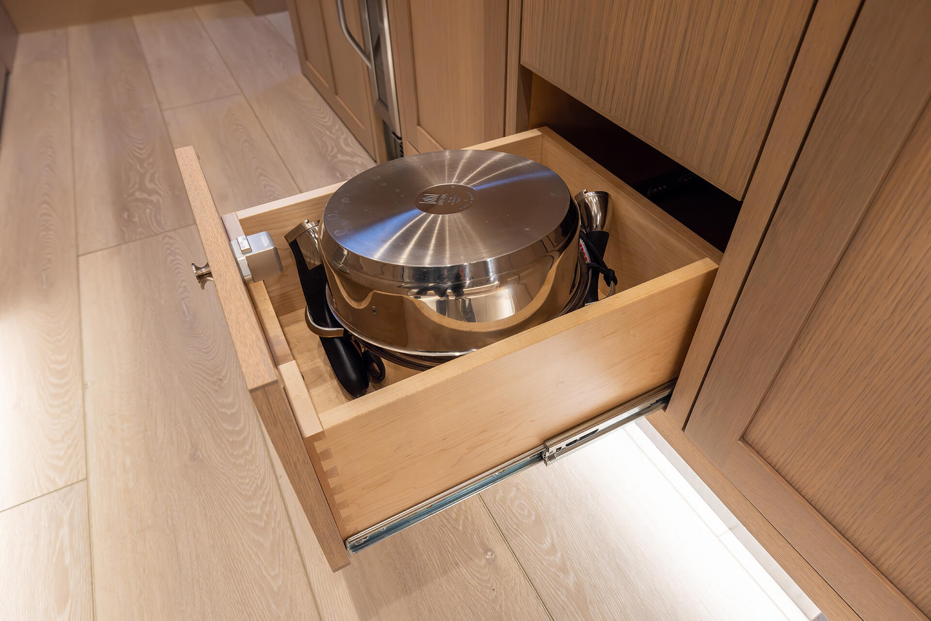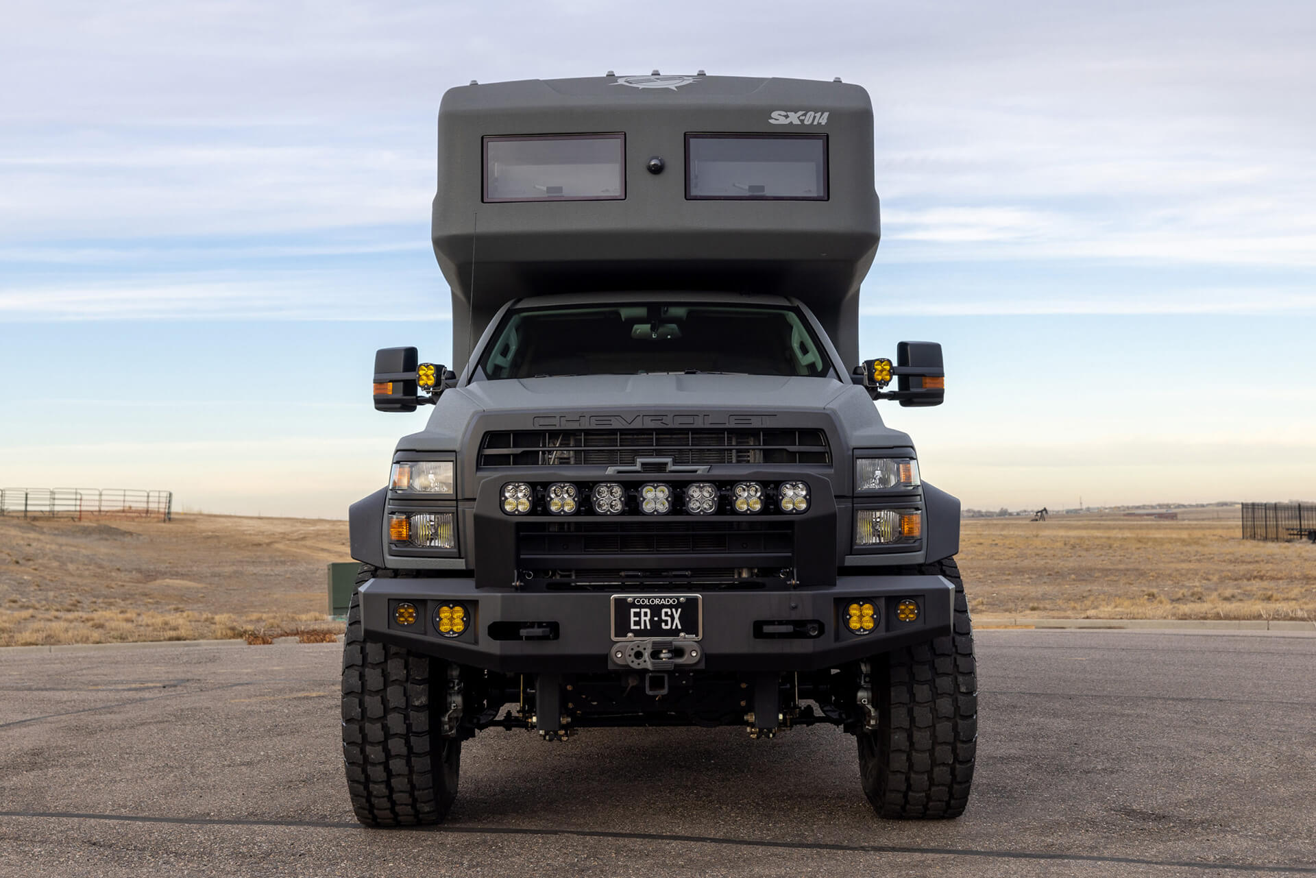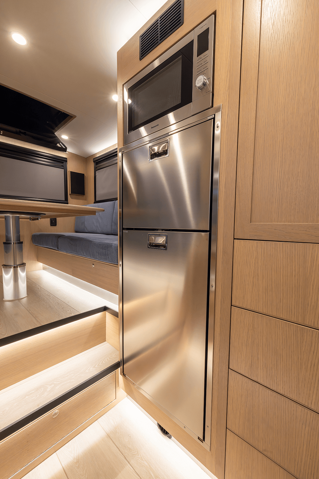 This 2024 XV-SX is ready to start traveling the country! The luxury interior of this EarthRoamer features custom Rift Oak cabinetry laid out in the Mount Shavano floor plan. SX-014 feels like home on the inside with a 12-piece set of EarthRoamer nesting induction cookware, EarthRoamer Logo Dinnerware, glasses, mugs, and silverware with custom quiet-ride storage organizers, and a three burner electric induction cooktop.