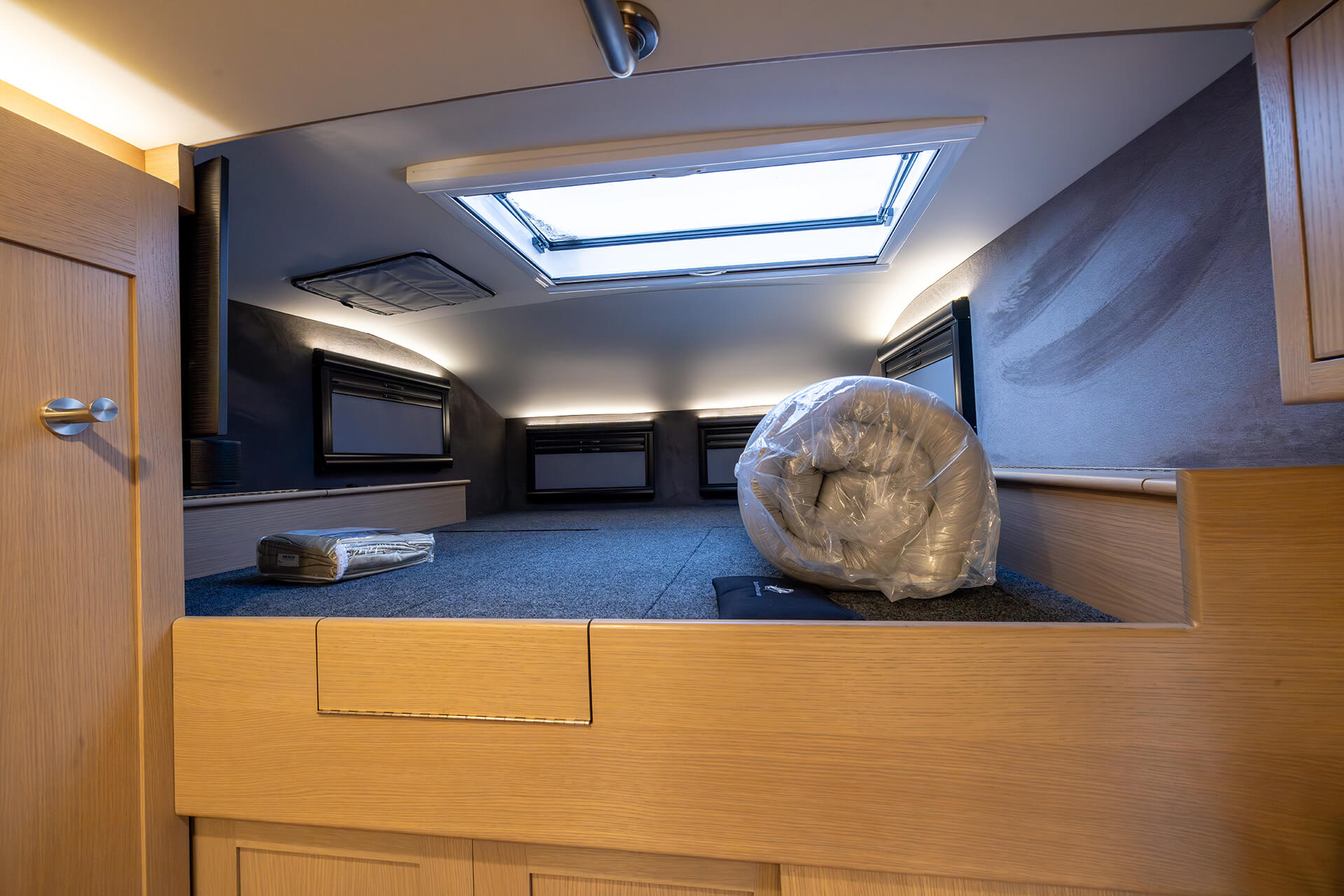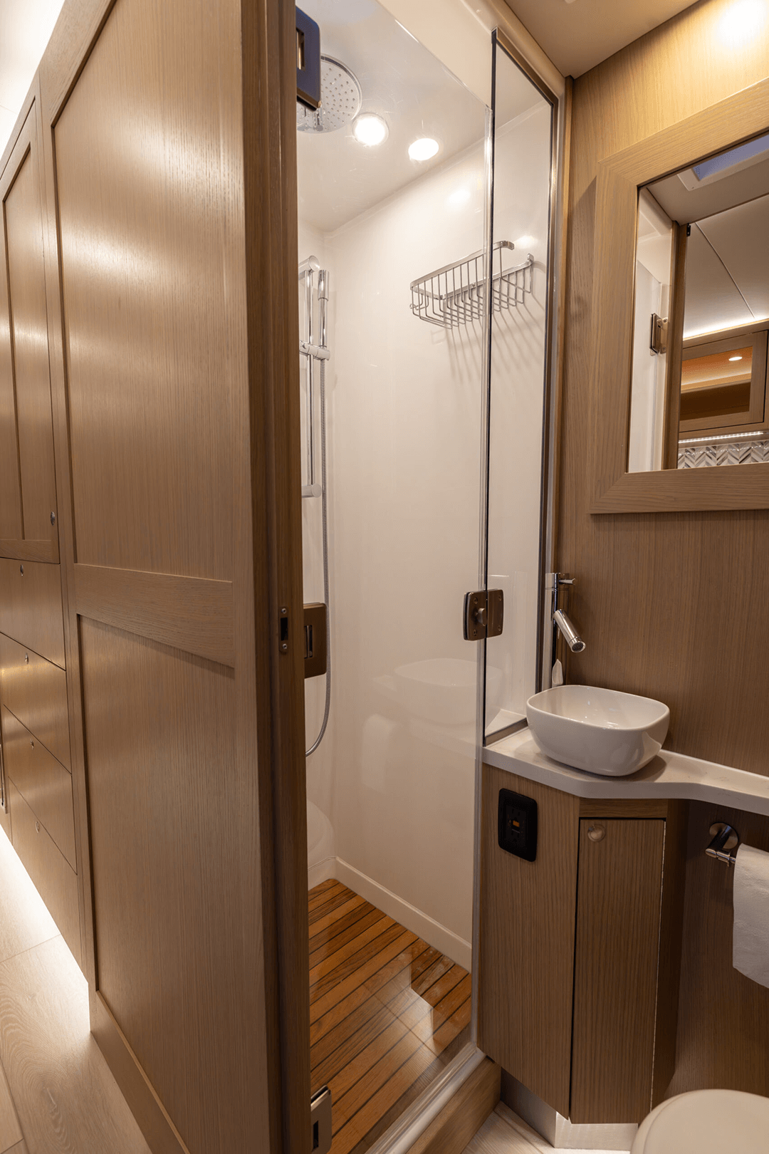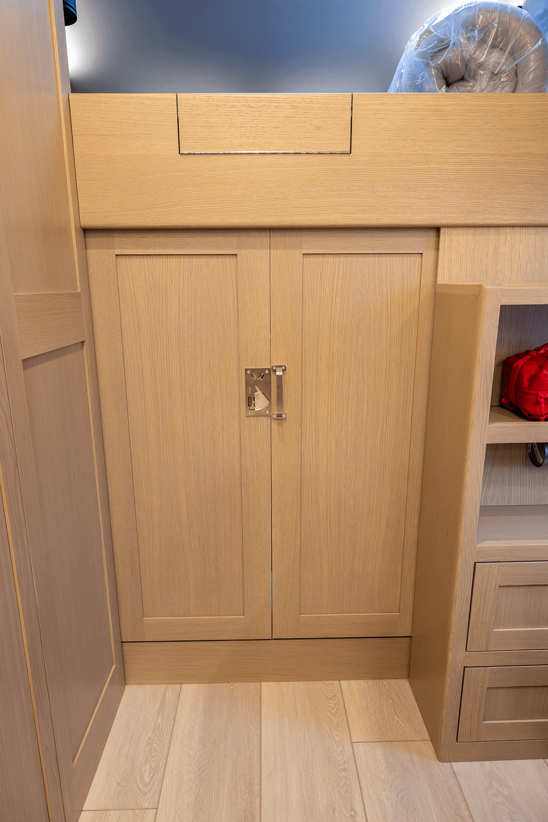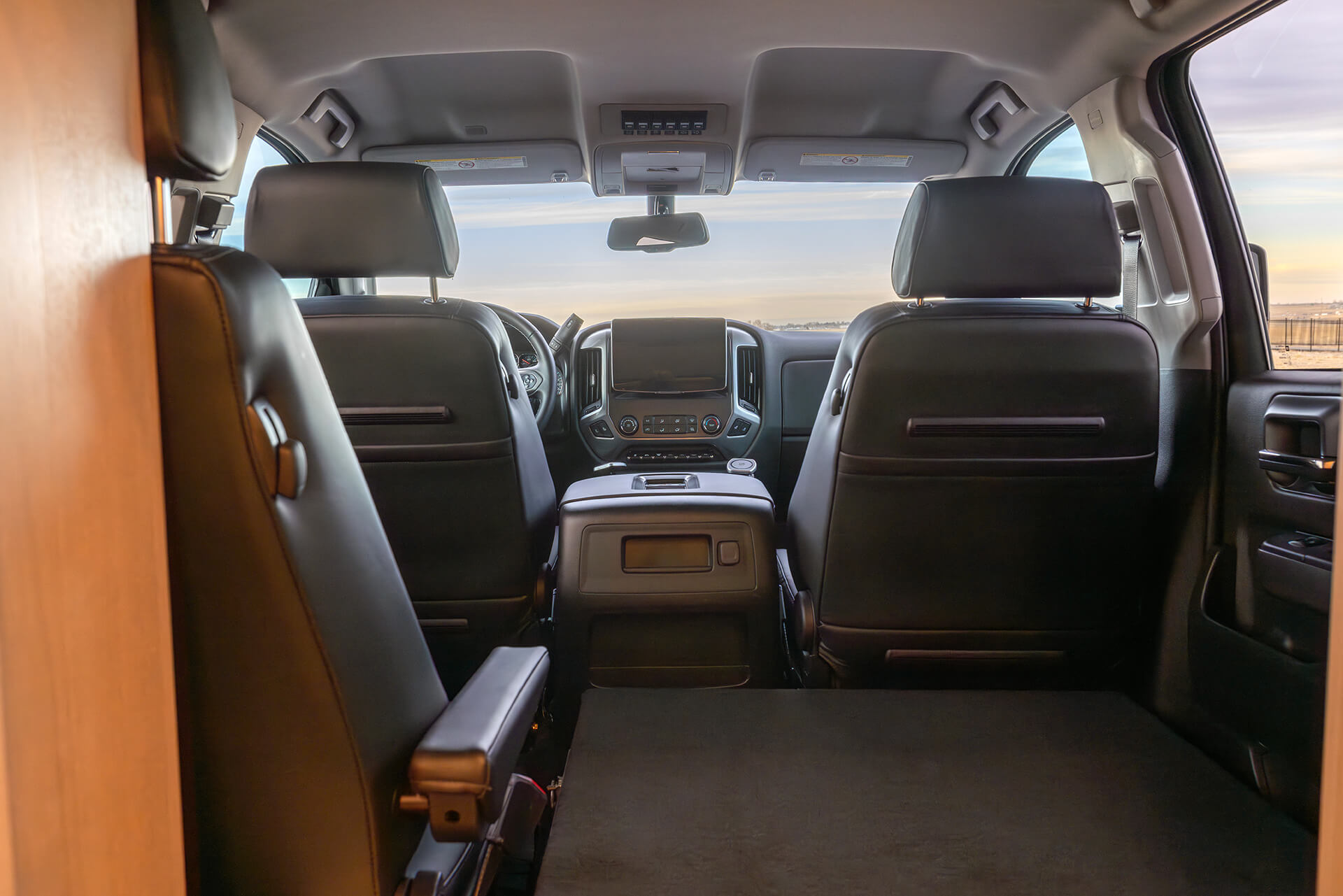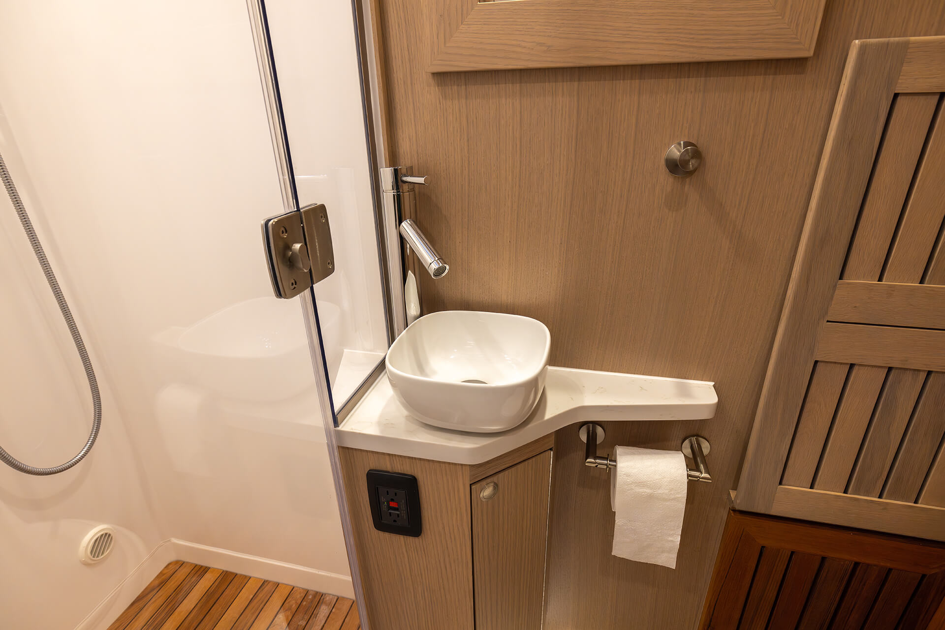This 2024 XV-SX is ready to start traveling the country! The luxury interior of this EarthRoamer features custom Rift Oak cabinetry laid out in the Mount Shavano floor plan. SX-014 feels like home on the inside with a 12-piece set of EarthRoamer nesting induction cookware, EarthRoamer Logo Dinnerware, glasses, mugs, and silverware with custom quiet-ride storage organizers, and a three burner electric induction cooktop.