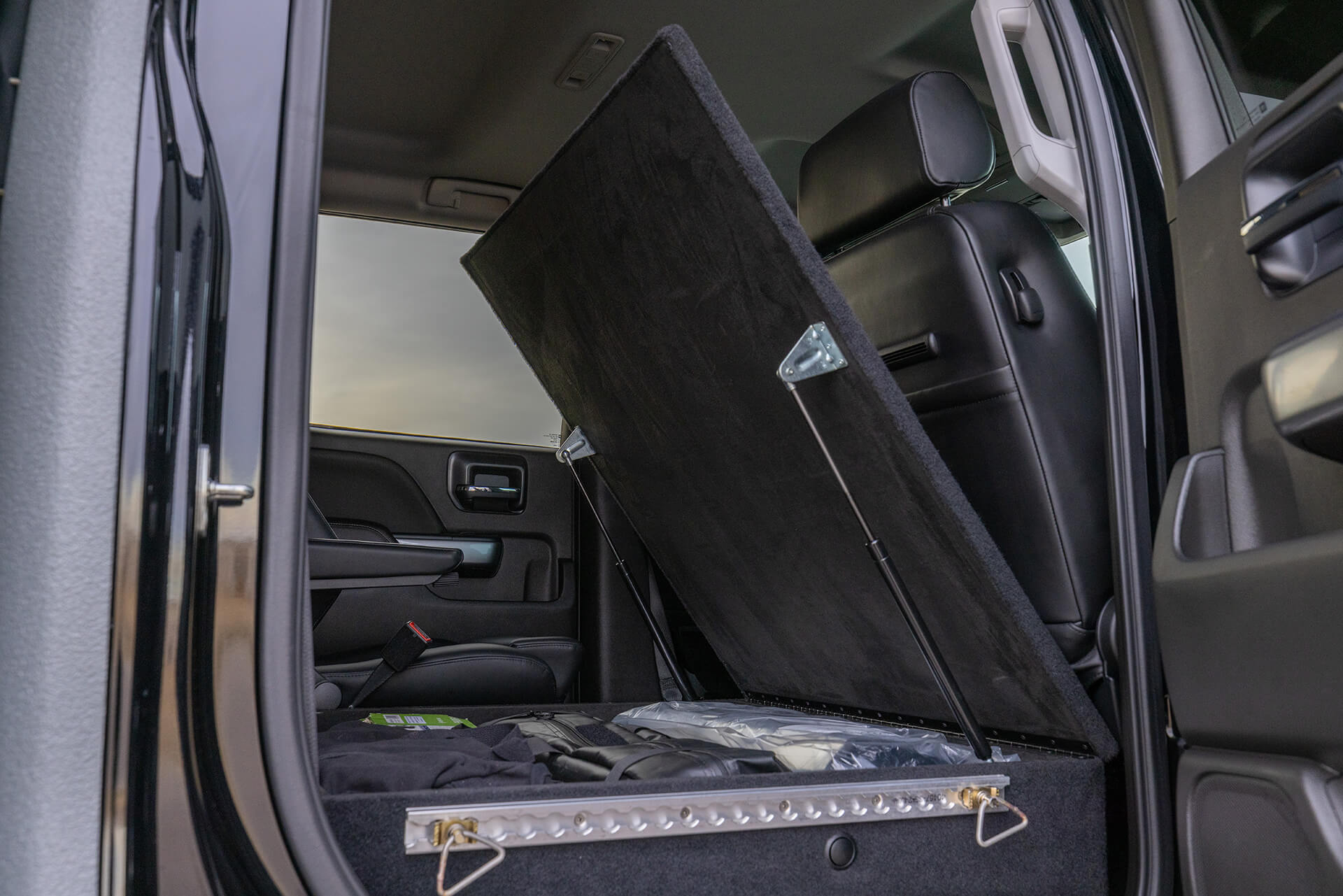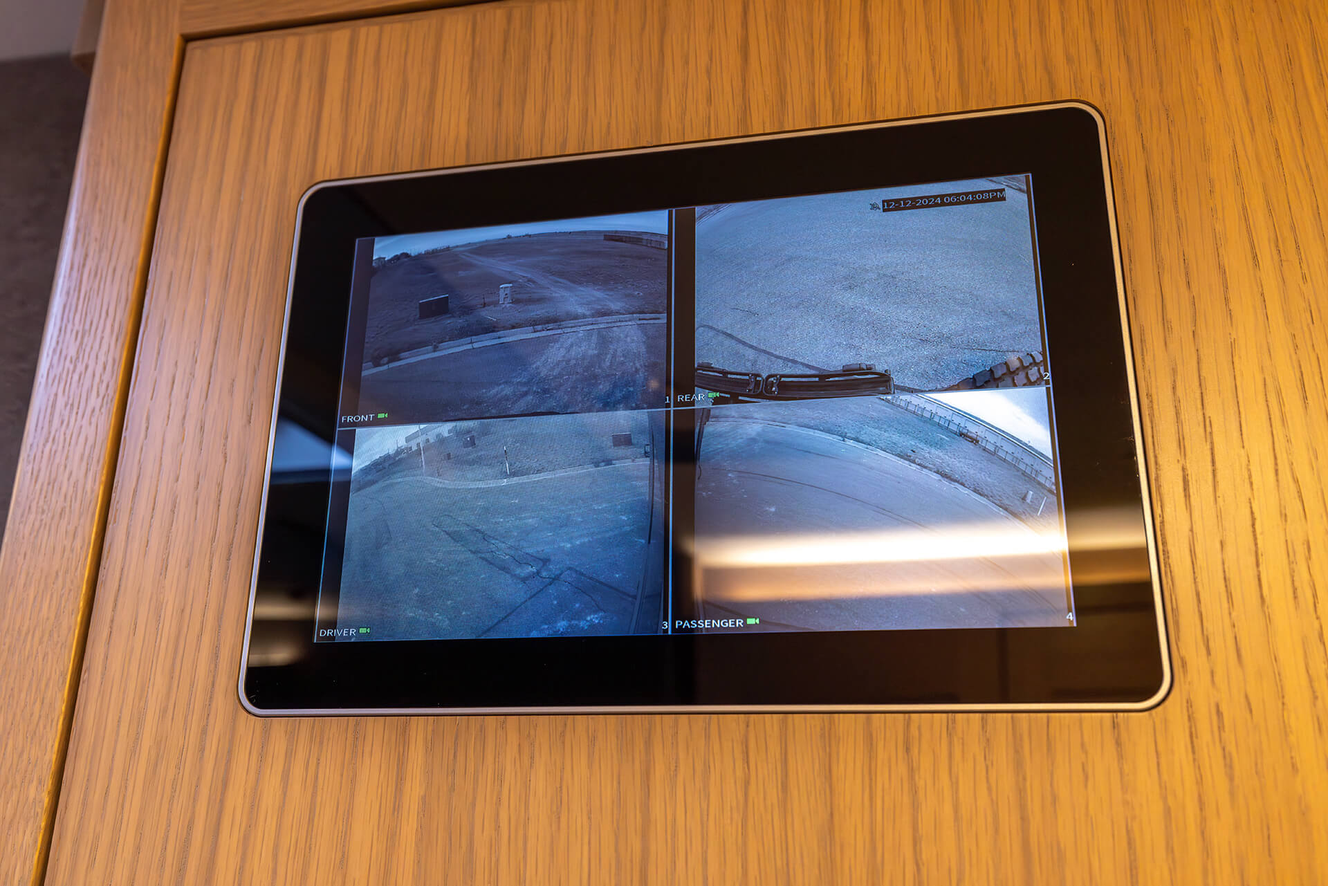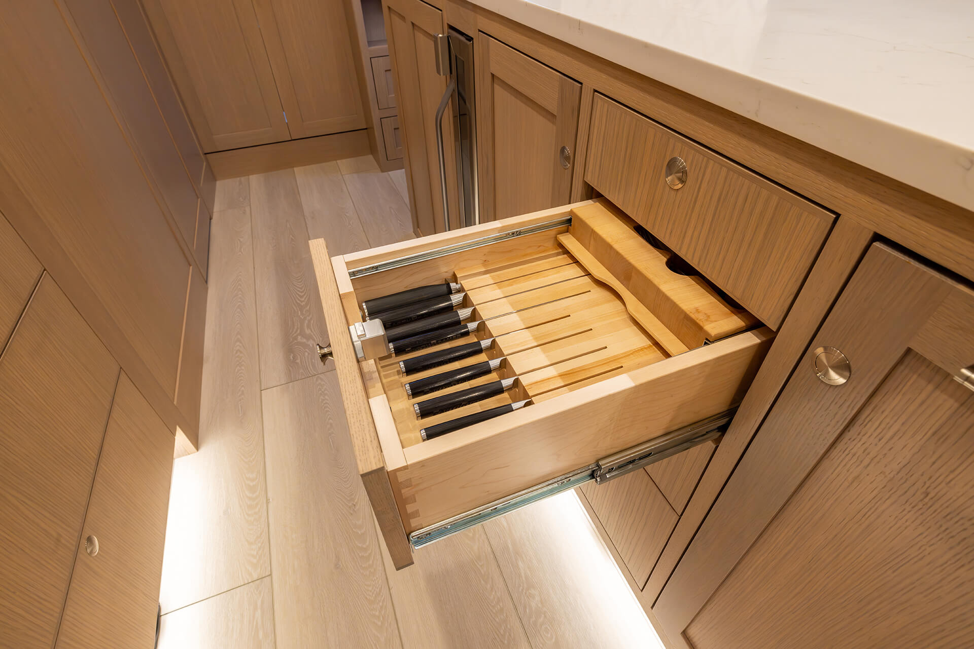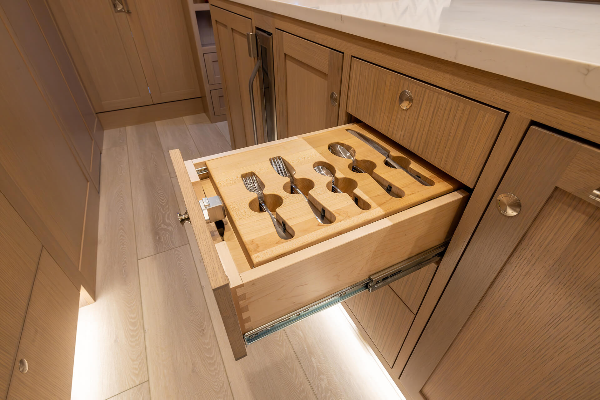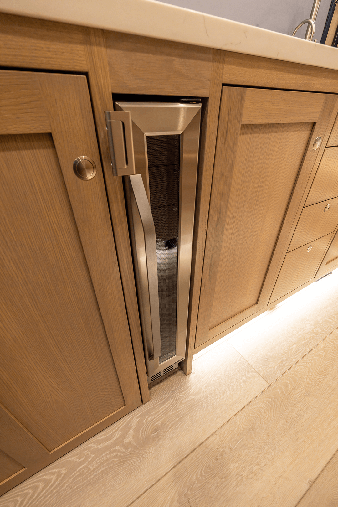 This 2024 XV-SX is ready to start traveling the country! The luxury interior of this EarthRoamer features custom Rift Oak cabinetry laid out in the Mount Shavano floor plan. SX-014 feels like home on the inside with a 12-piece set of EarthRoamer nesting induction cookware, EarthRoamer Logo Dinnerware, glasses, mugs, and silverware with custom quiet-ride storage organizers, and a three burner electric induction cooktop.